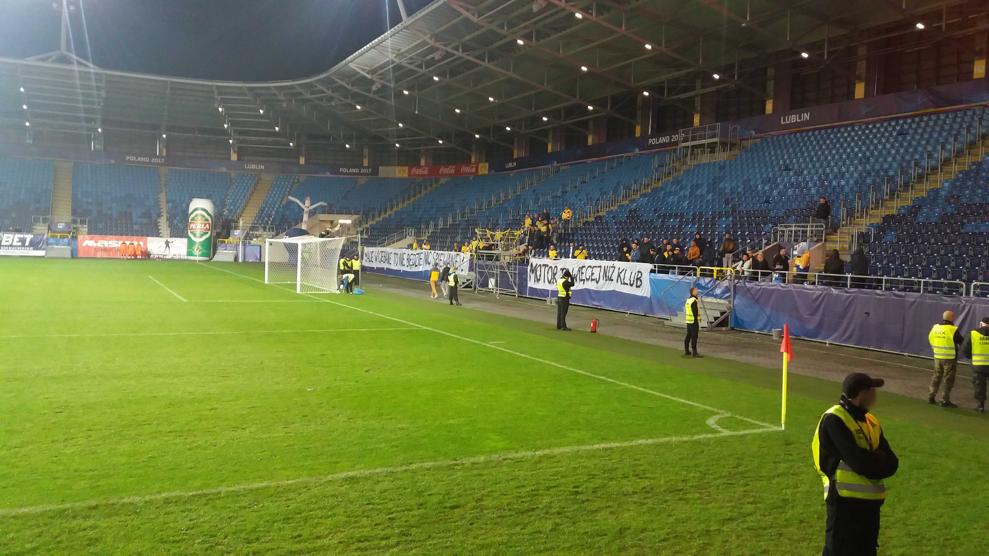 |  | | Nie wywołało to jednak szaleństwa w młynie gospodarzy. W poprzedniej kolejce Motor przegrał 0:6 z Sołą Oświęcim, stąd kibice postanowili, że na dzisiejszym meczu przeprowadzą protest | |