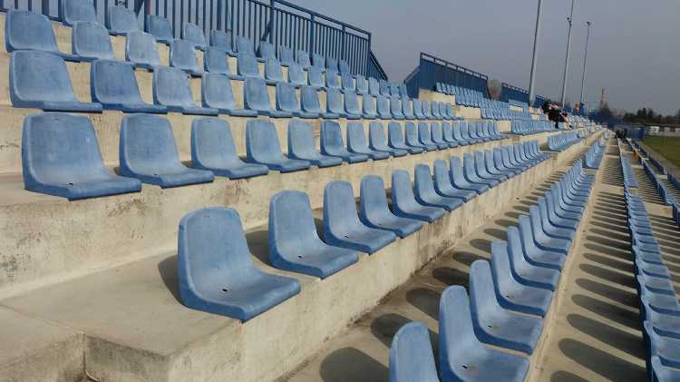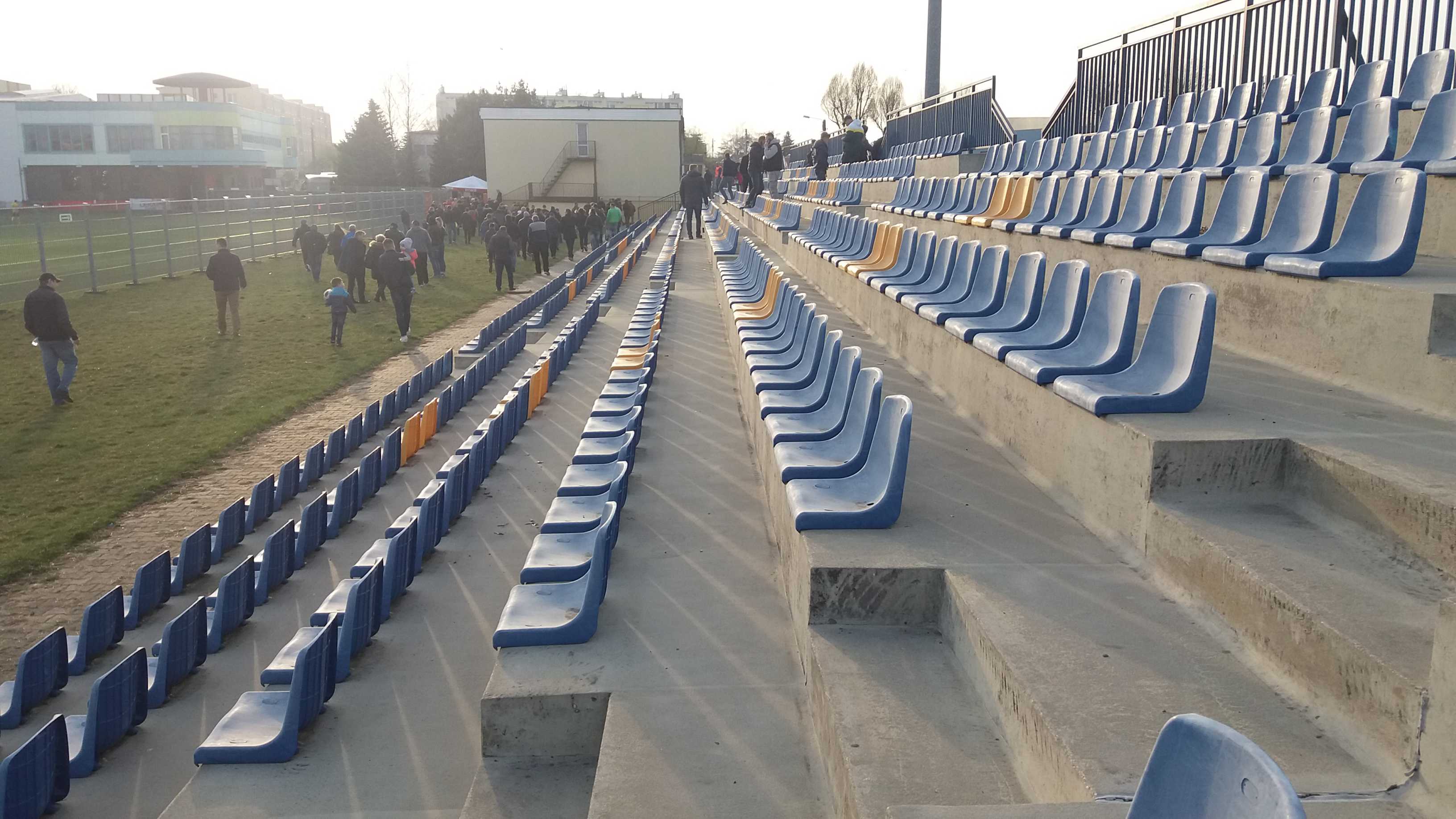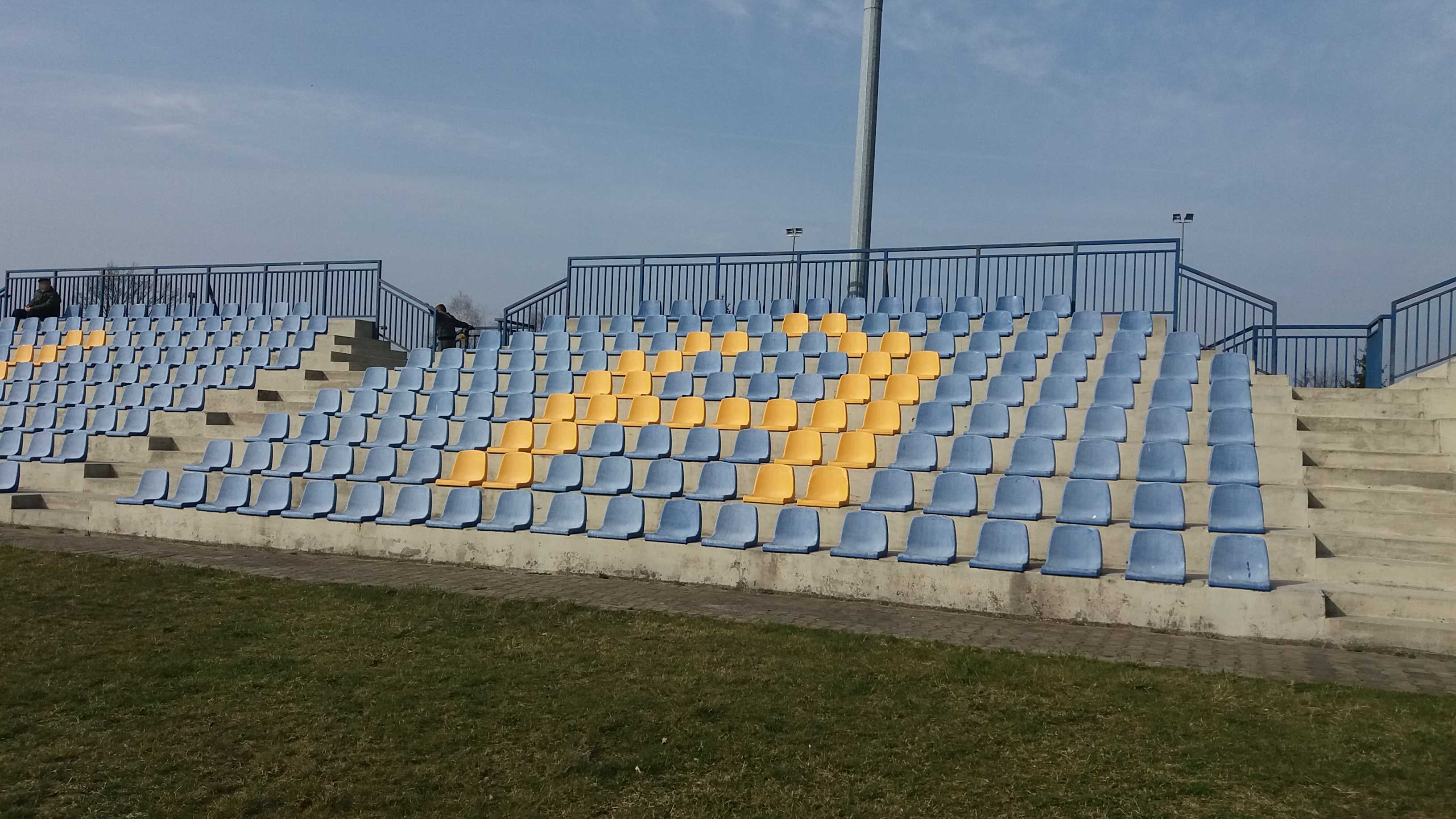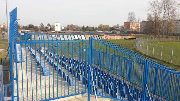 |  | | Trybuna, która pewnie kiedyś była główna - dziś znajdują się tam stanowiska dla spikerów i mediow. Oraz ławki rezerwowych | |