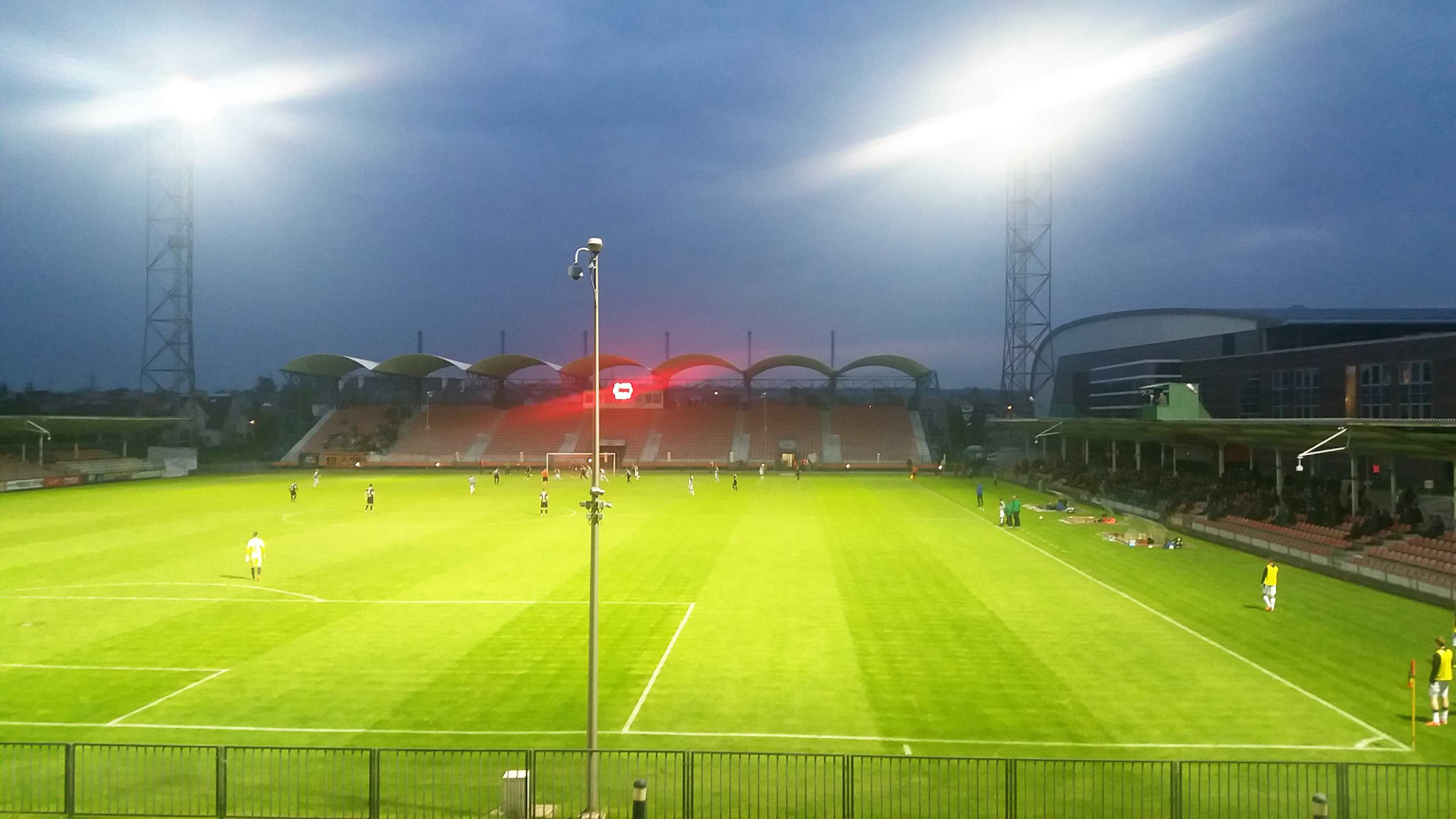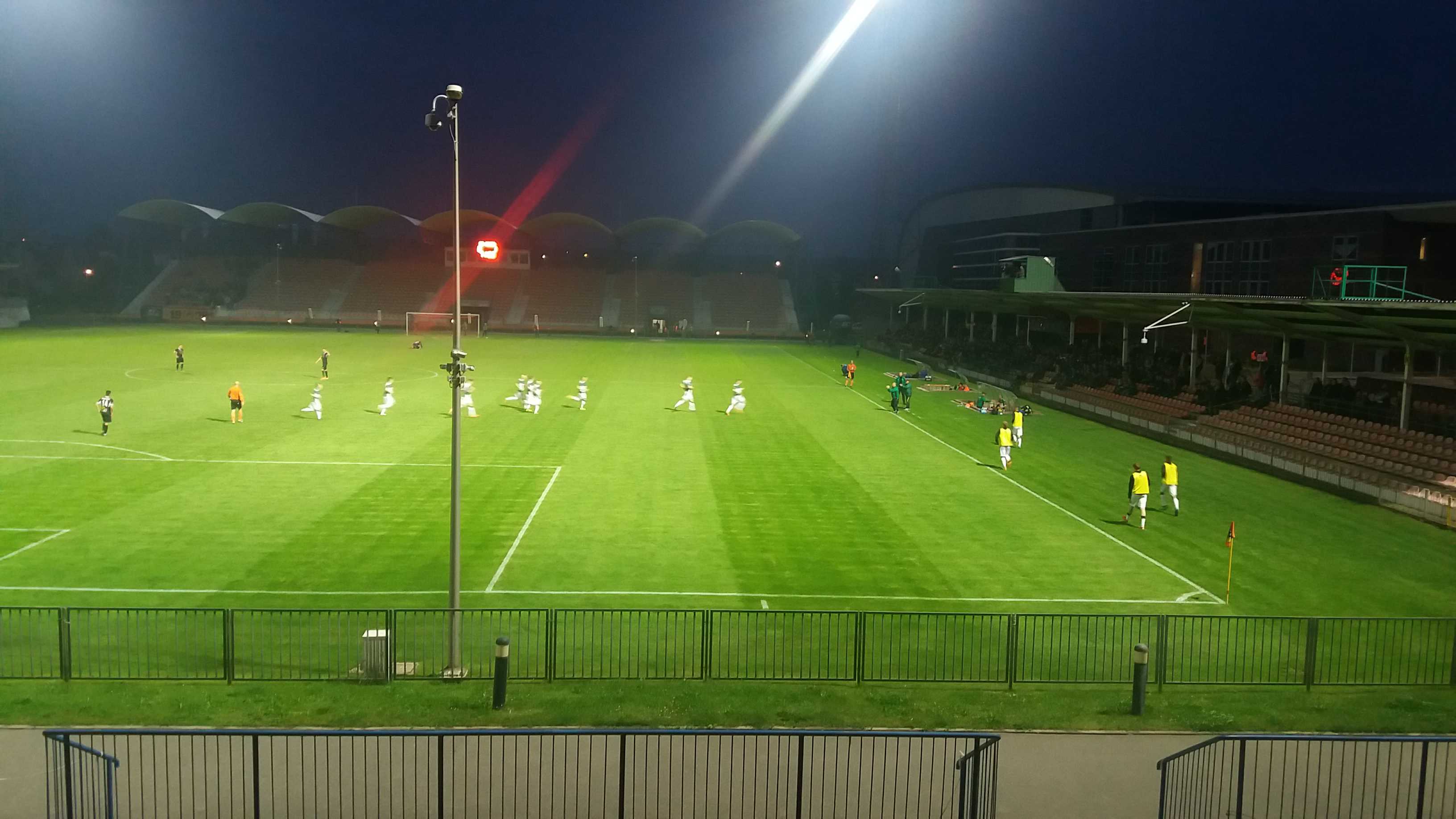 |  | | Widok na murawę z trybuny północnej. Jest wysoko. Na minus odległość od linii końcowej boiska | |