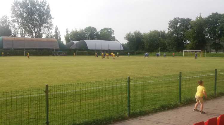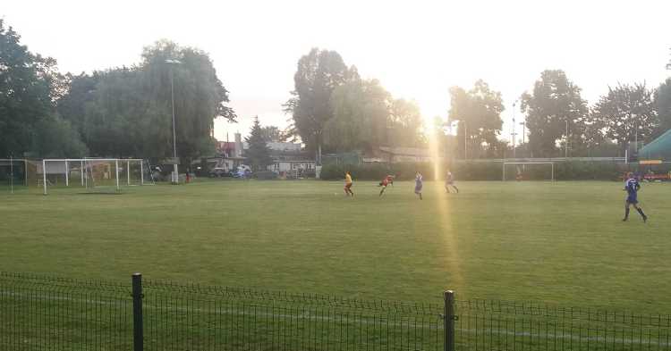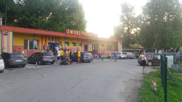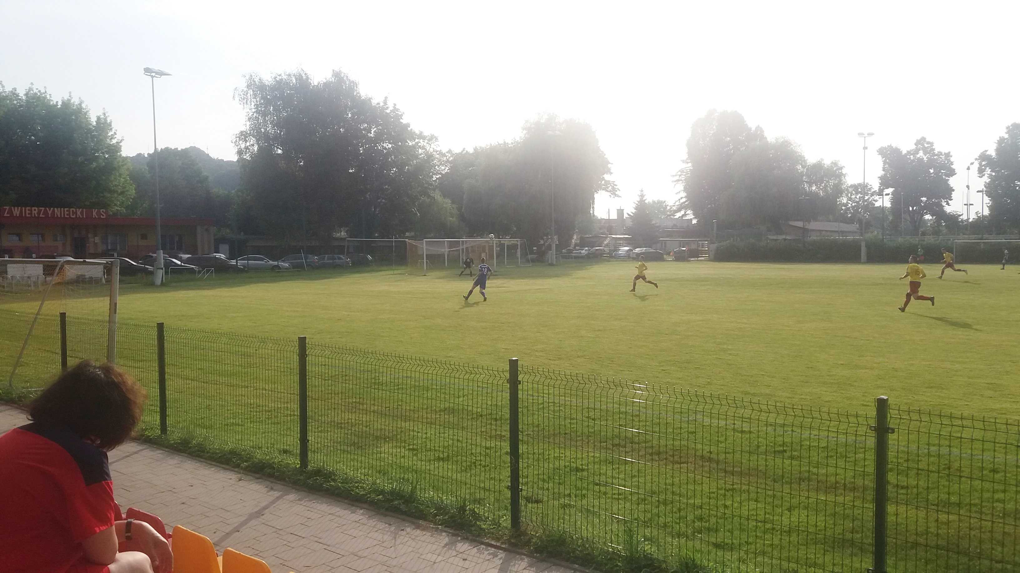 |  | | Bramkarz Bieżanowianki wraca z piłką na boisko, a spostrzegawczy powinni dojrzeć jednego z rezerwowych Zwierzynieckiego KS-u poszukującego piłki za linią końcową | |