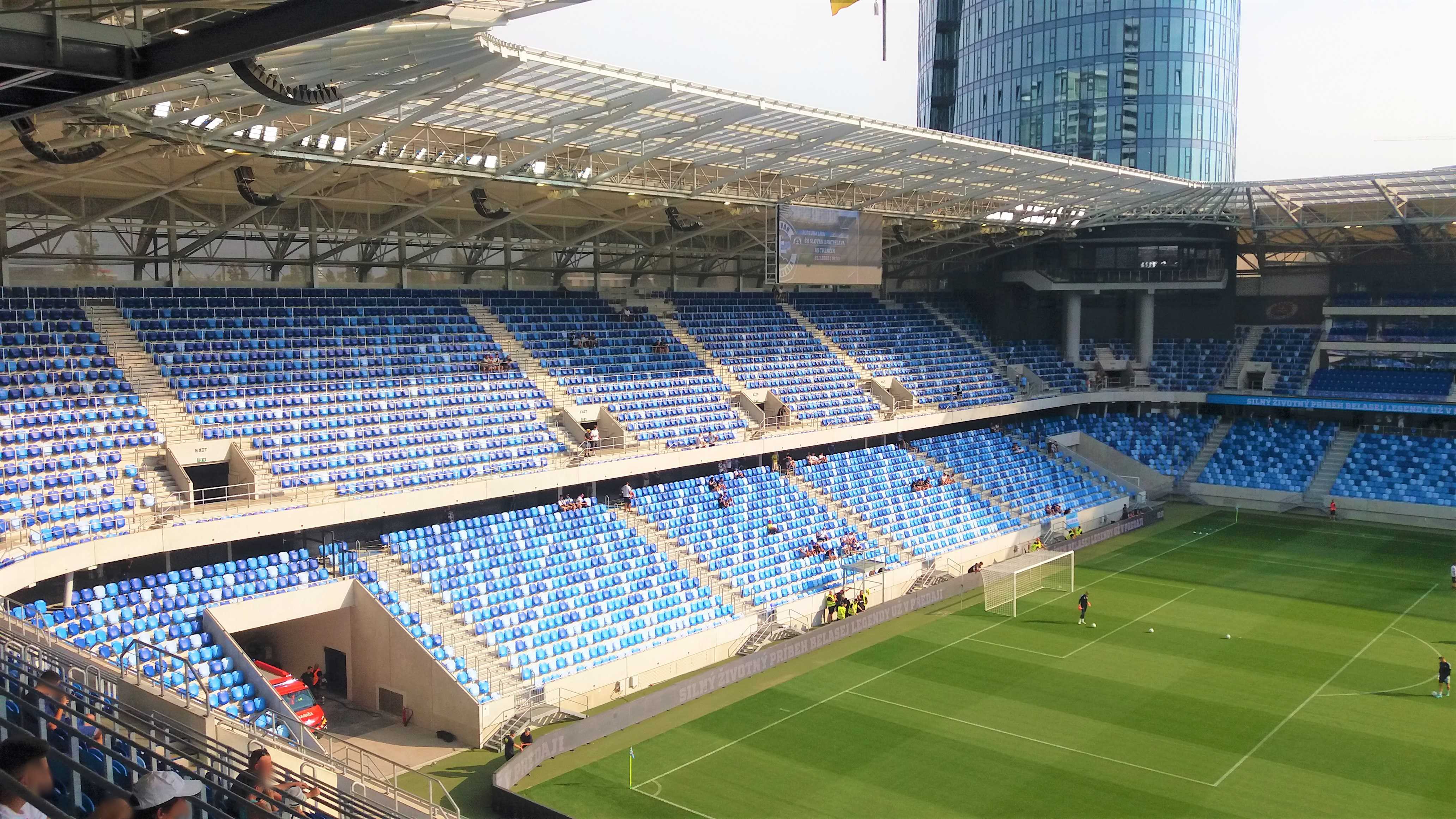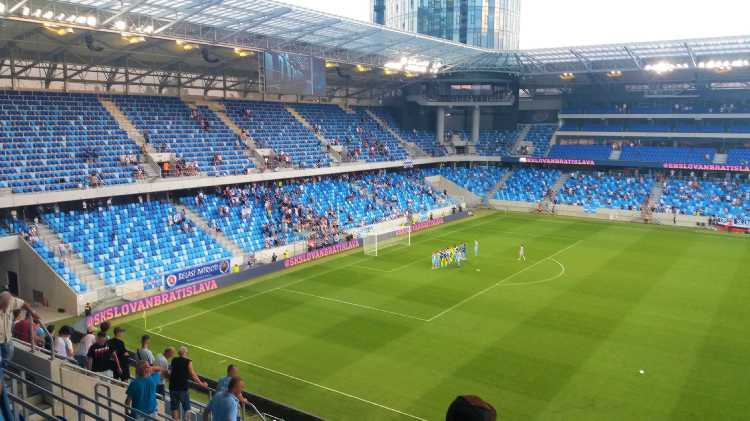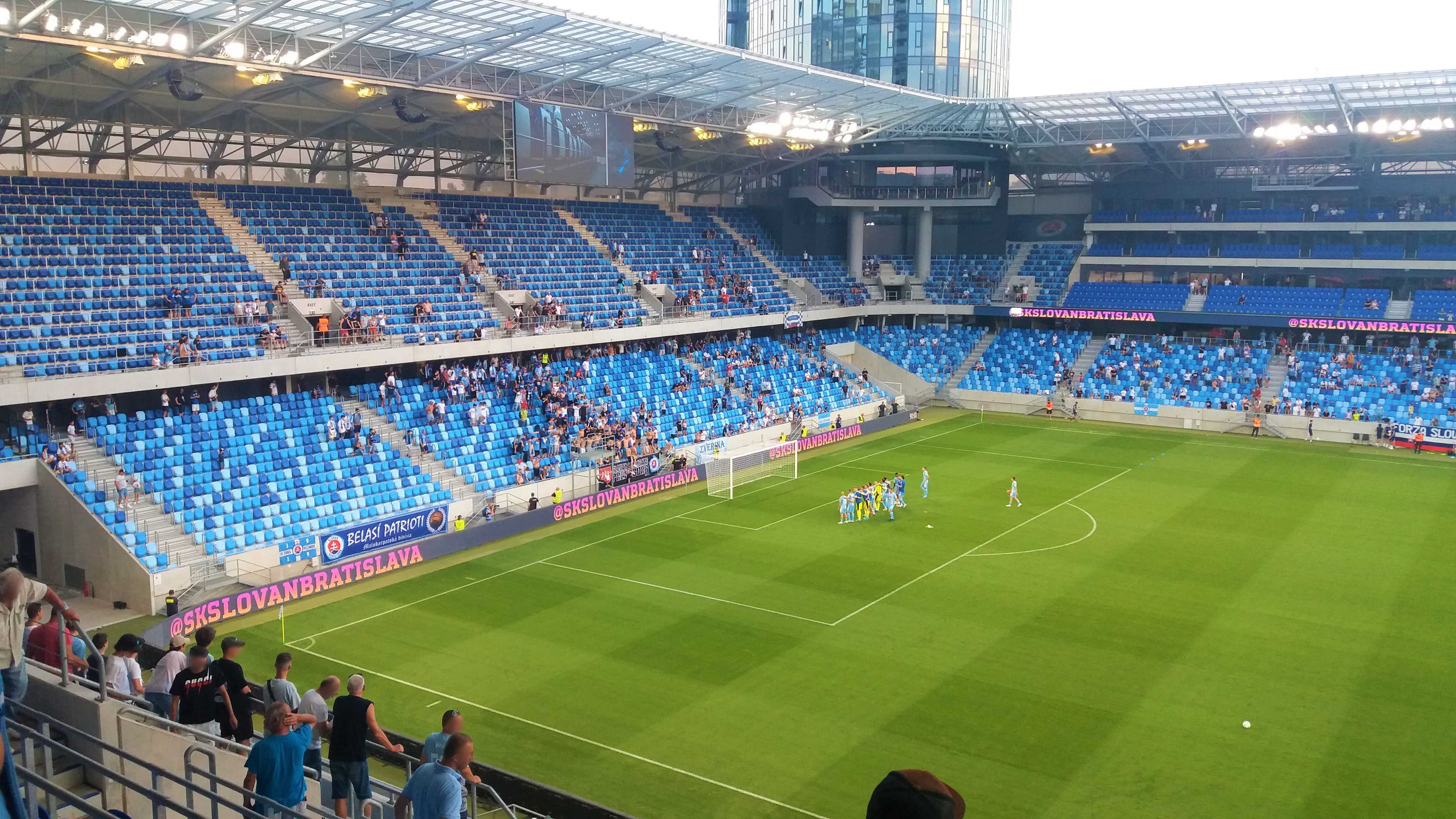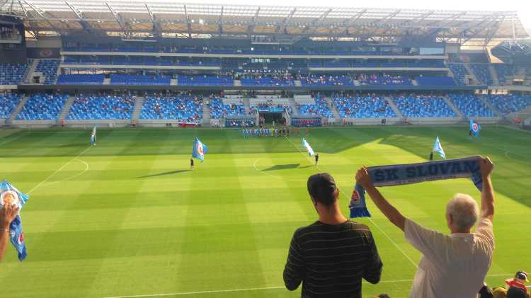|  | | Na murawie dzieciaki trzymają flagi z historycznymi herbami Slovana (zwróćcie uwagę, że nikt się zbytnio nie przejmuje faktem, że na wielu z nich są motywy z czerwoną gwiazdą) z głośników leci hymn Slovana | |
