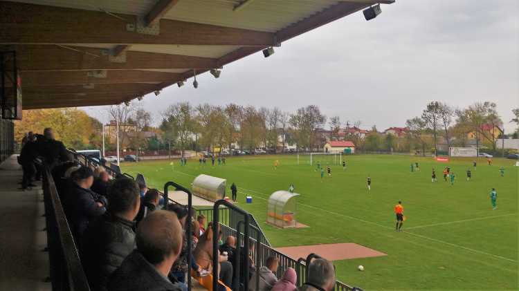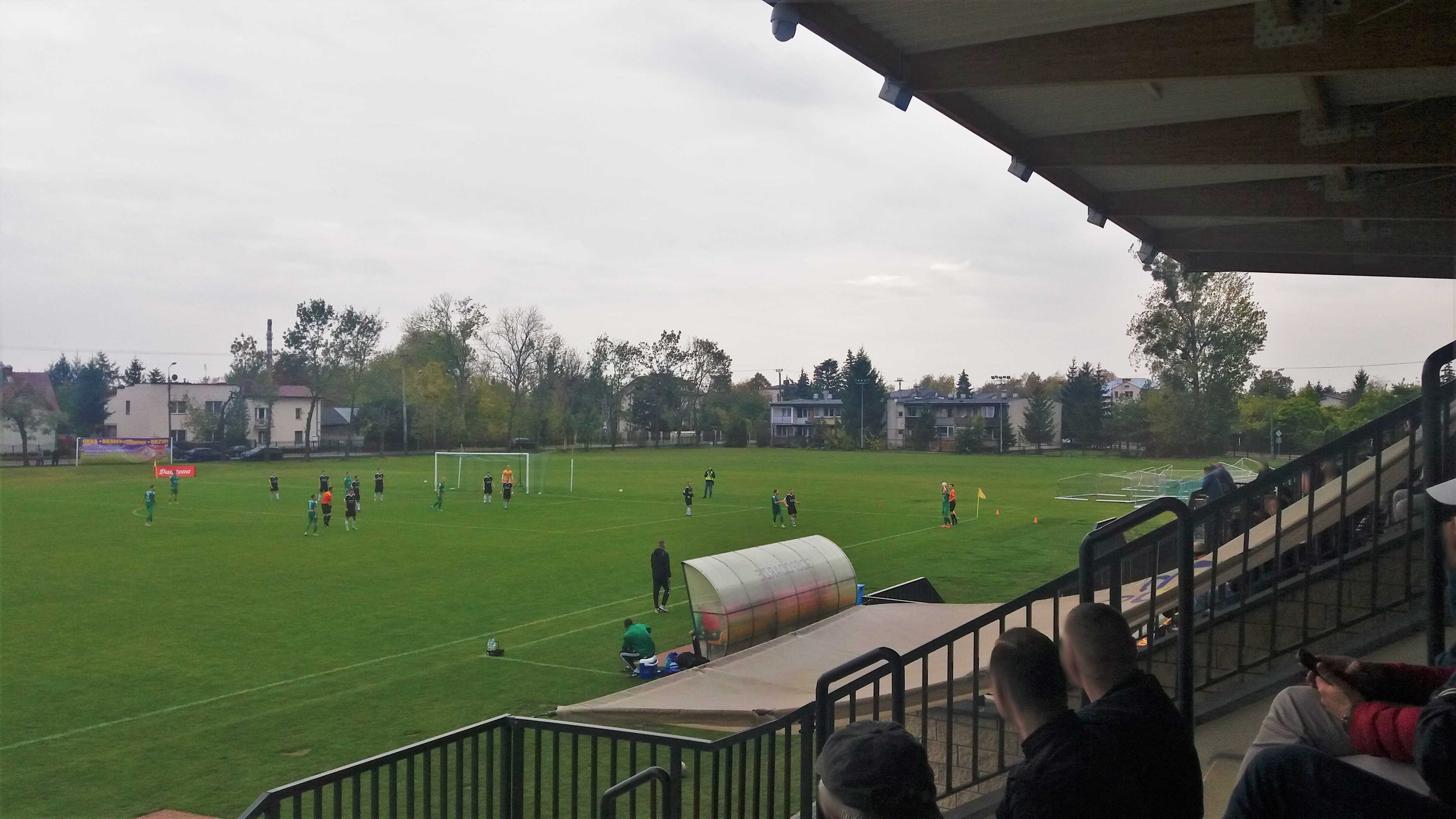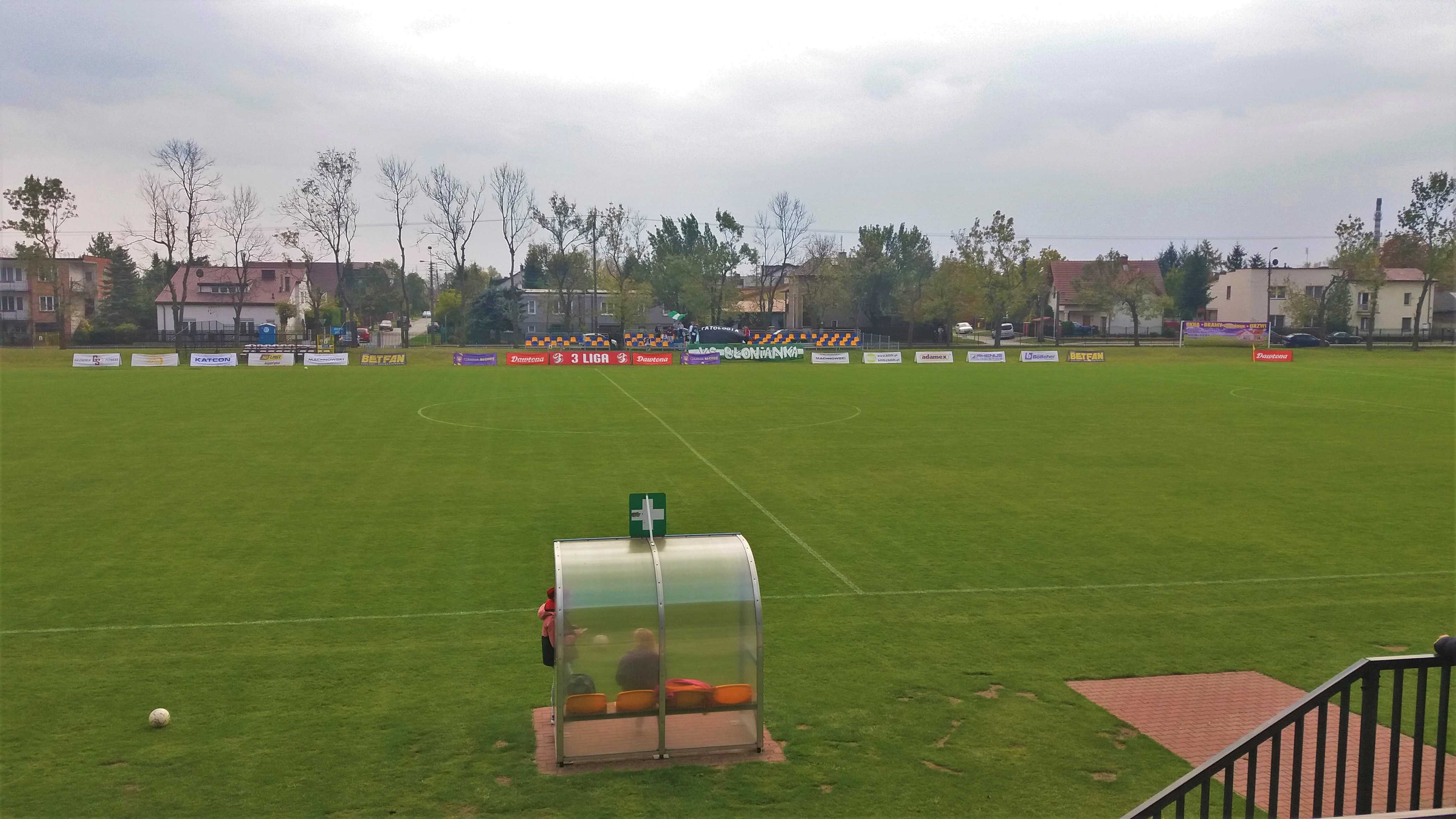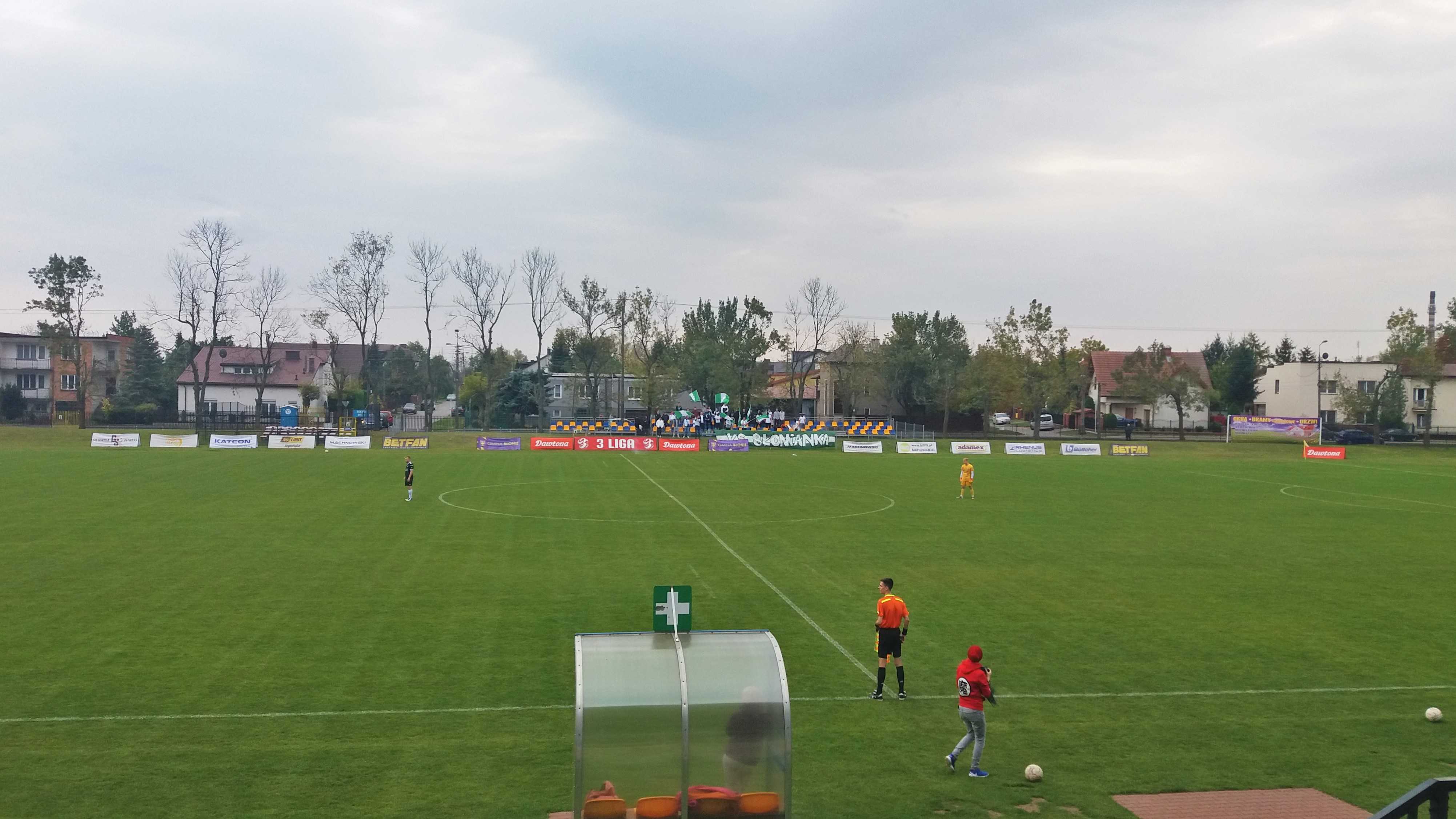 |  | | Gracze Blonianki wykonują rzut wolny, a boisko jest nadal daleko od trybuny | |