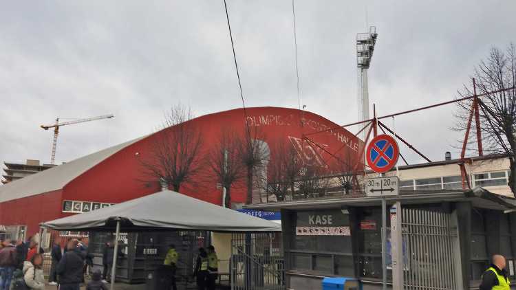 ![]() | Przed główną bramą stadionu - widać budynki kasowe i bramki biletowe | |||