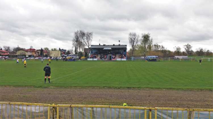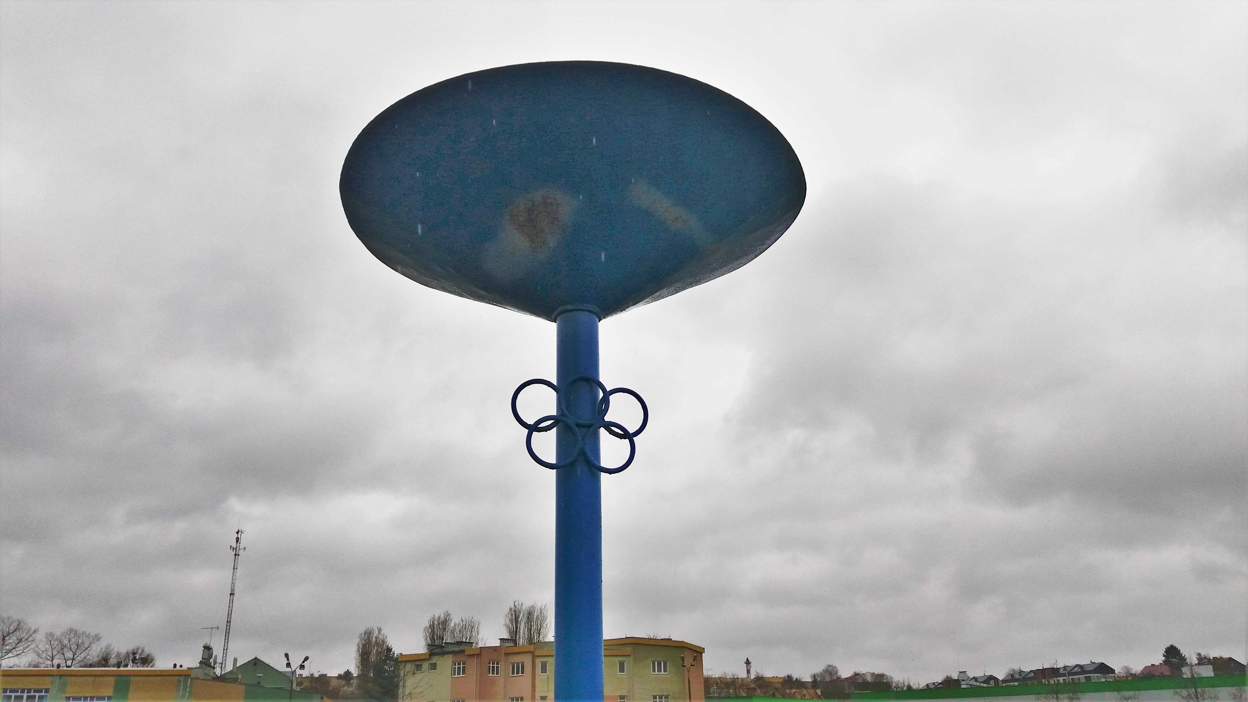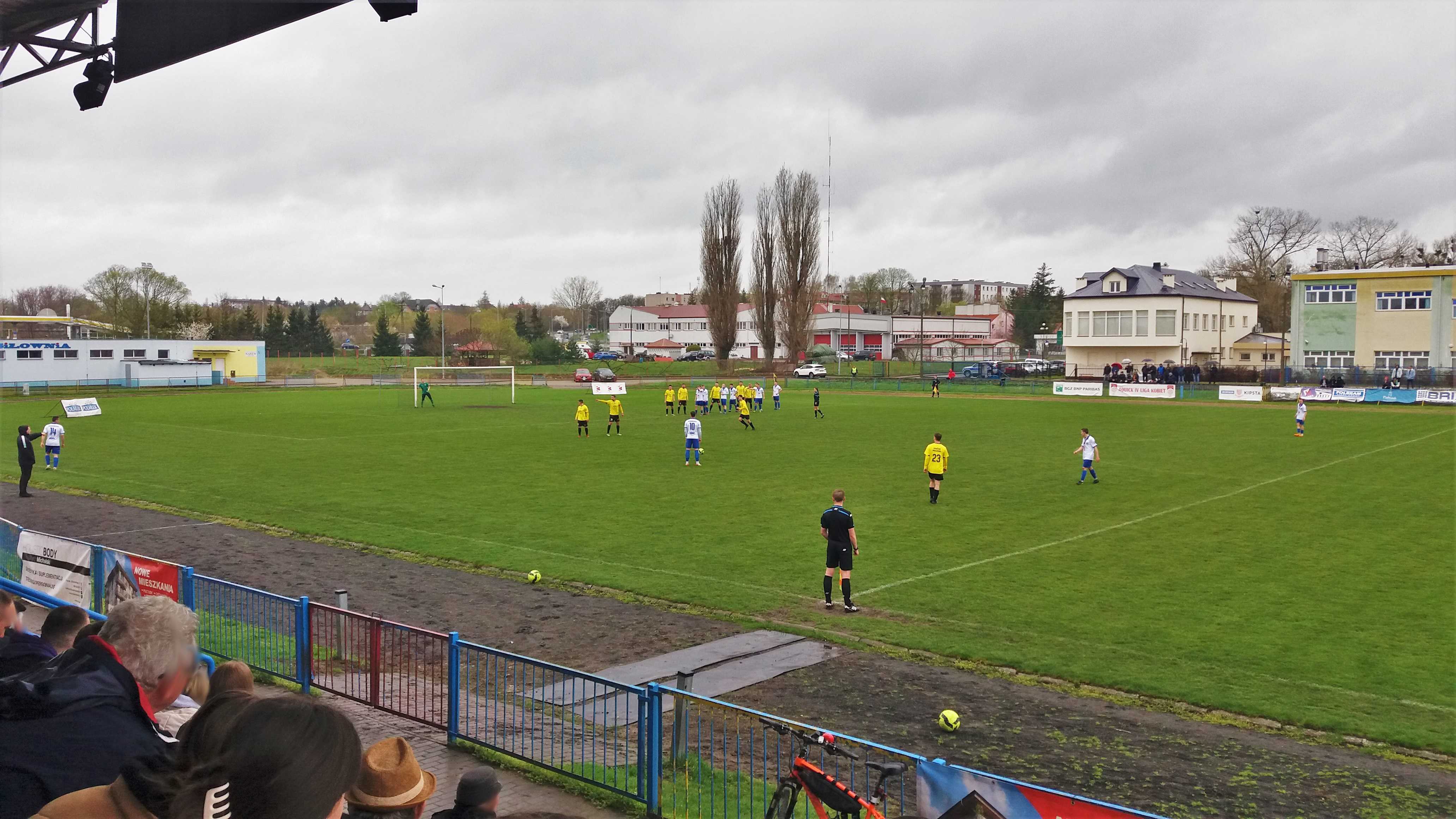 |  | | Widok wzdłuż linii bocznej boiska, jak żywcem wyjęty z PRL-u. Zwracam uwagę na przepiękną niebieską latarnię/znicz | |