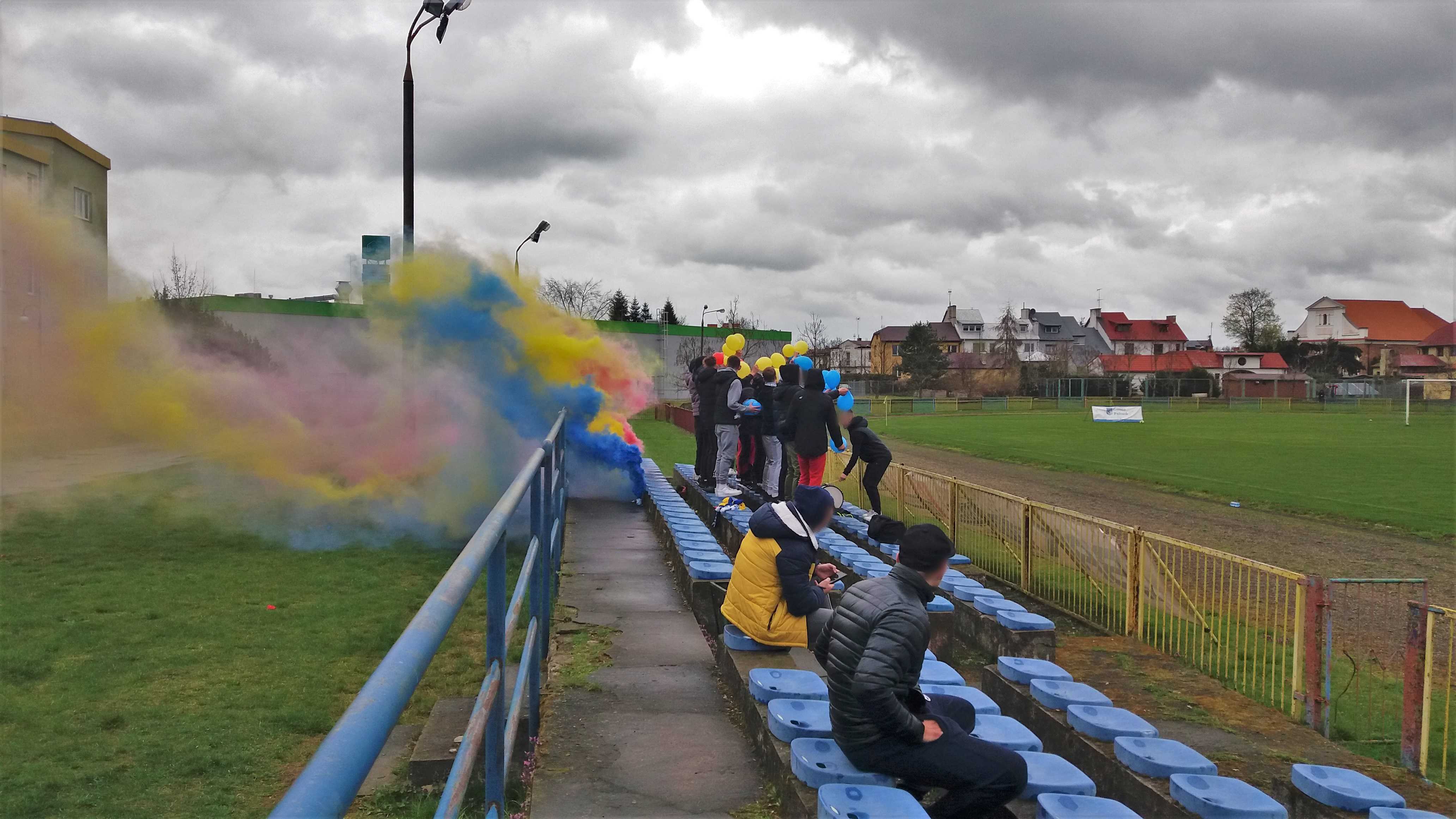 |  | | Piłkarze grają, a w oddali widać grupkę kibiców dopingujących w młynku | |