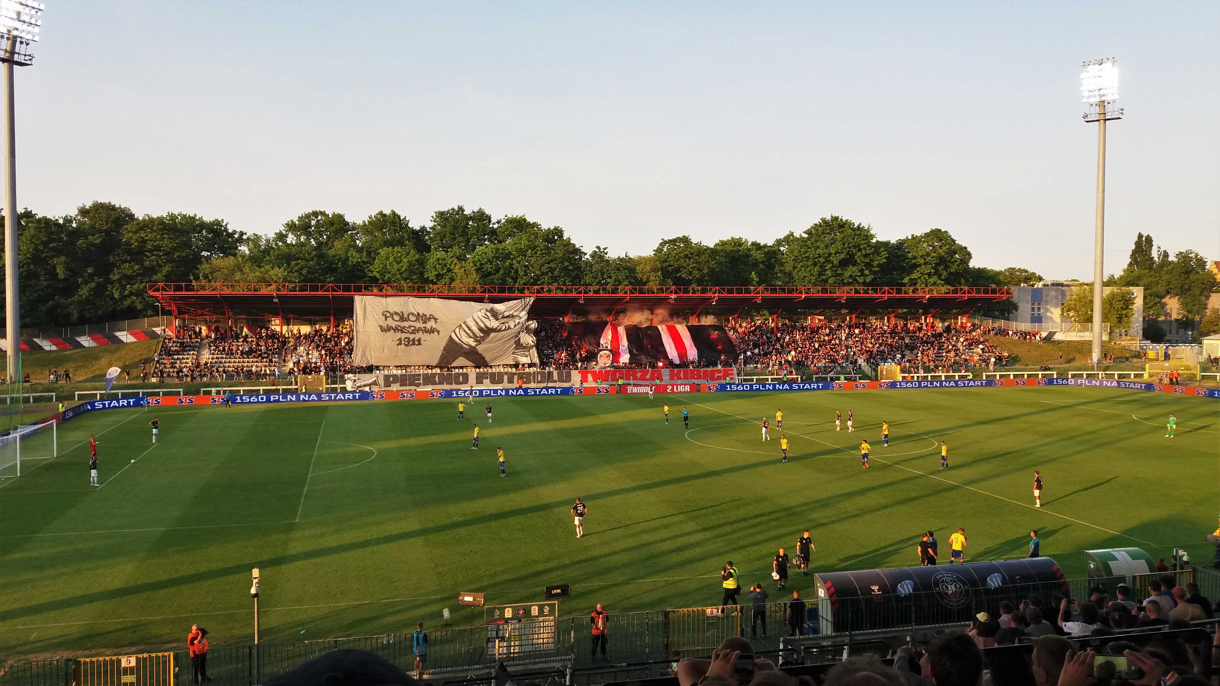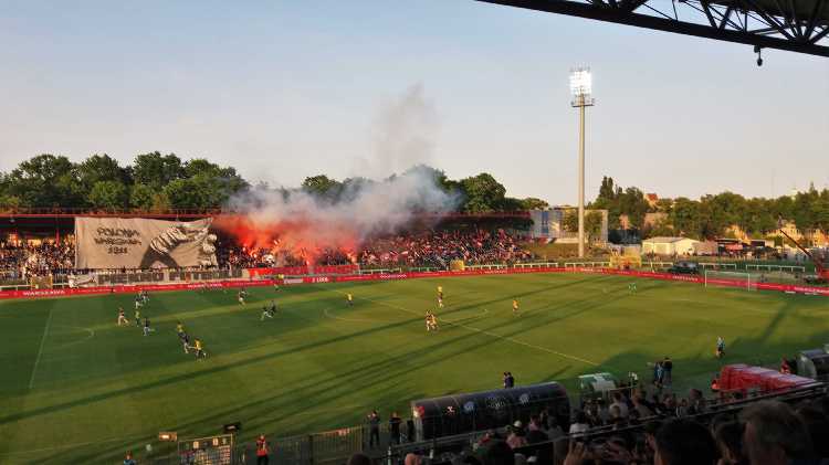 |  | | 53. minuta meczu - grupa kibiców Polonii triumfalnie wraca z oprawą na trybunę Kamienną | |