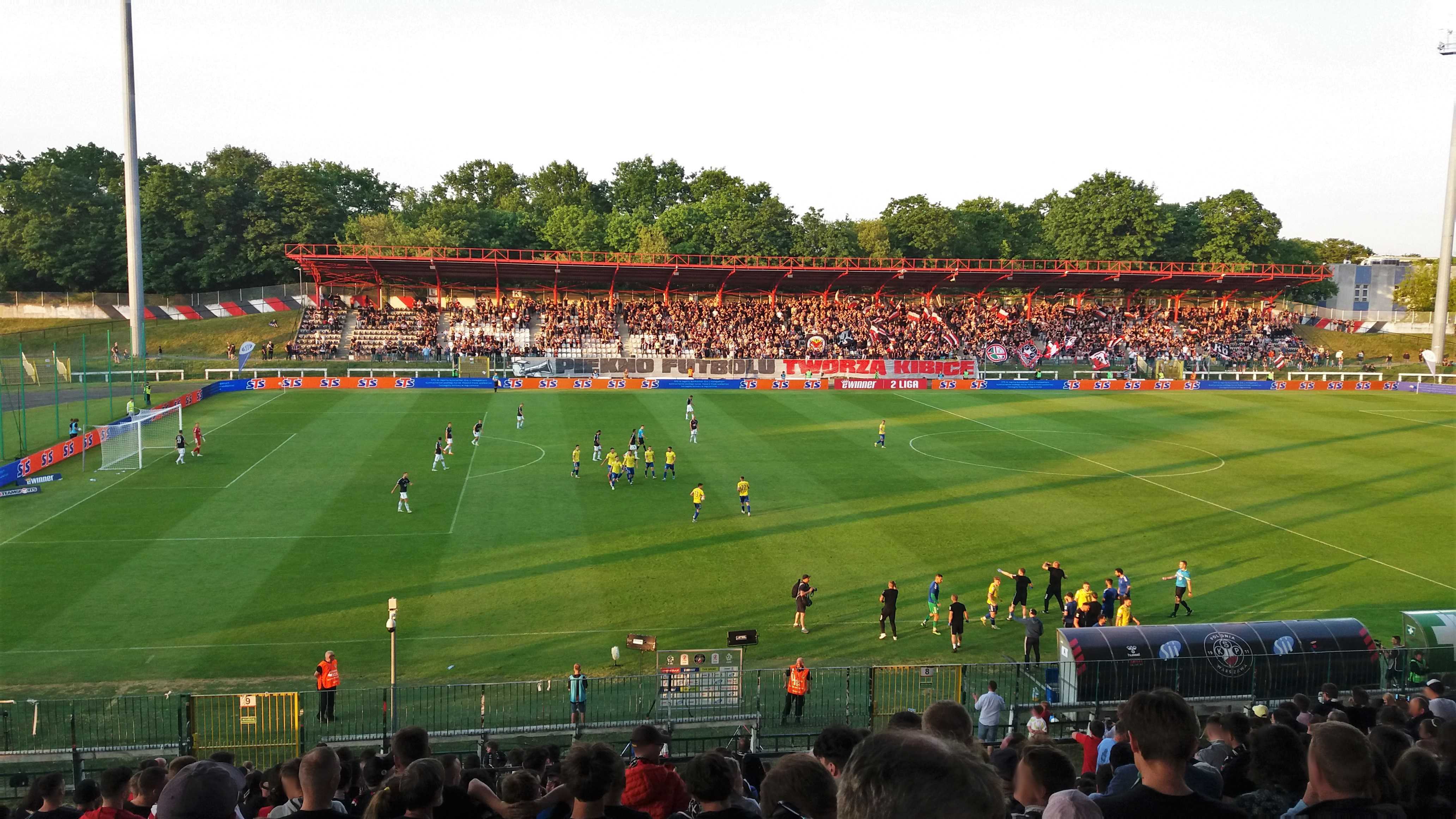 |  | | Radość piłkarzy Polonii oraz pikników na Trybunie Głownej | |