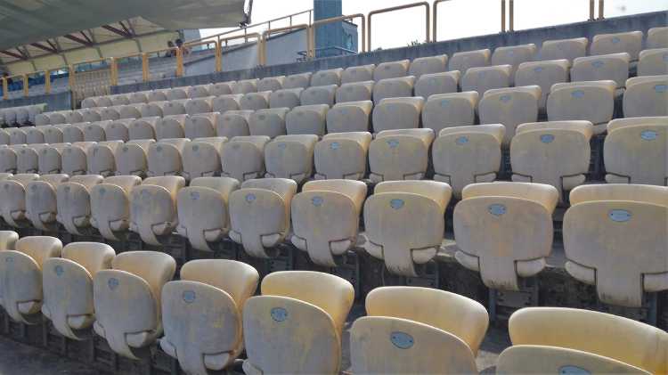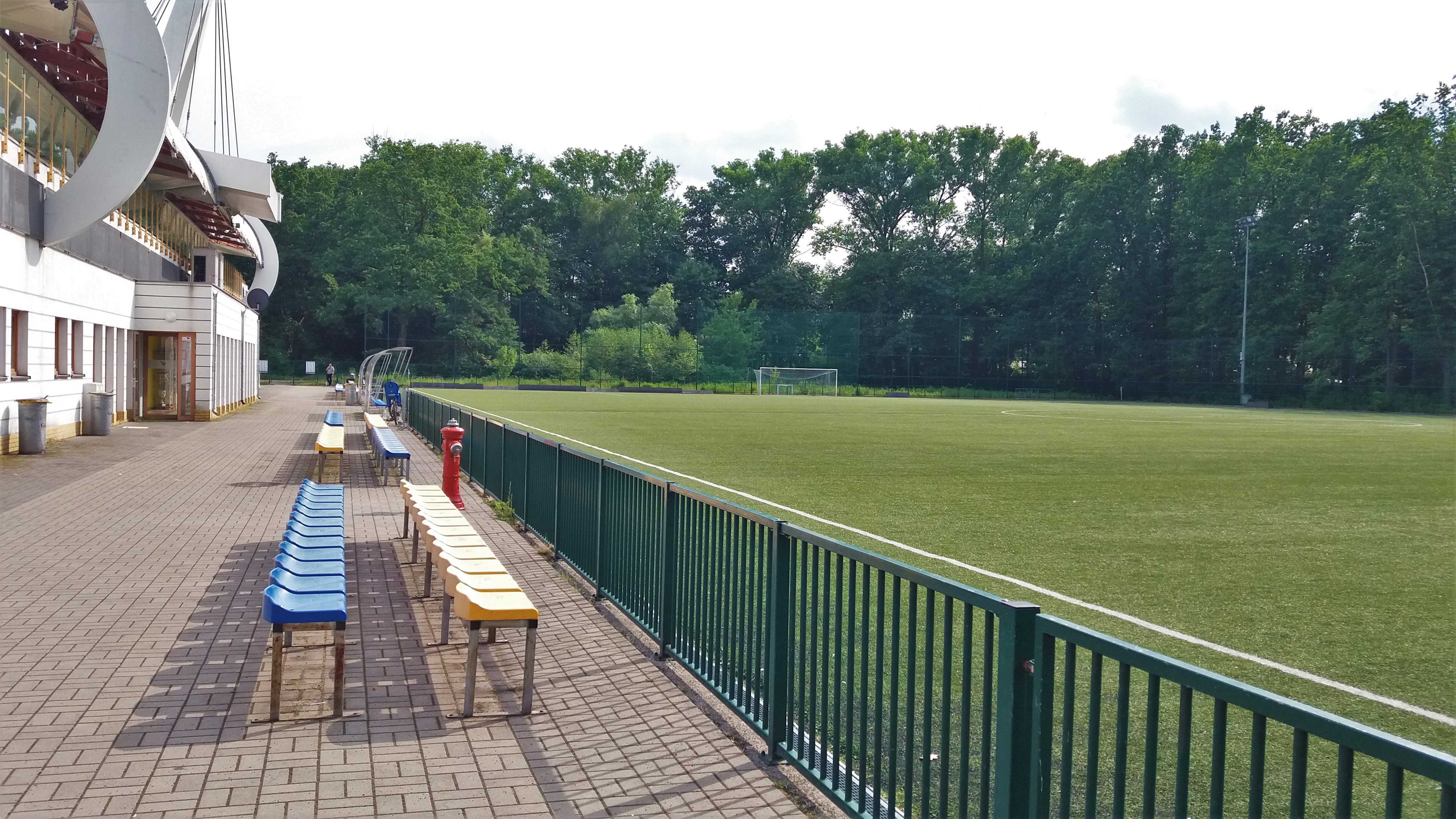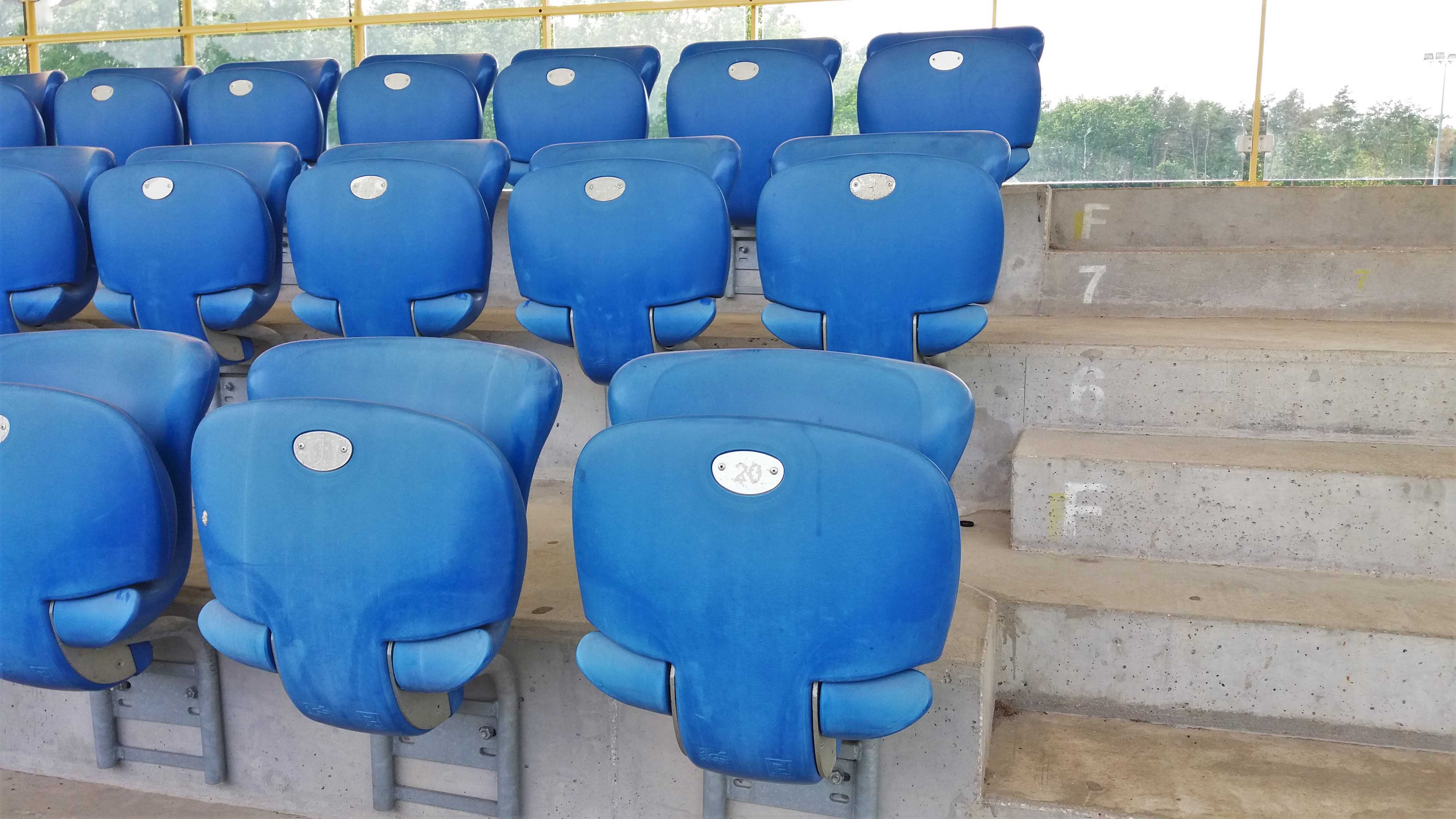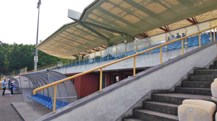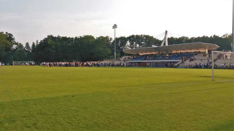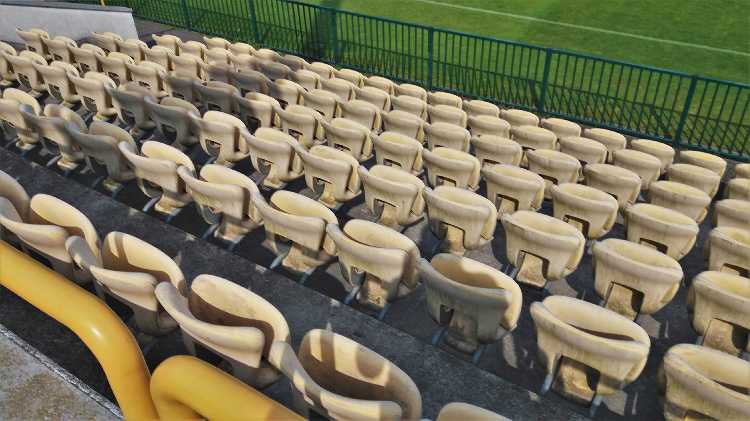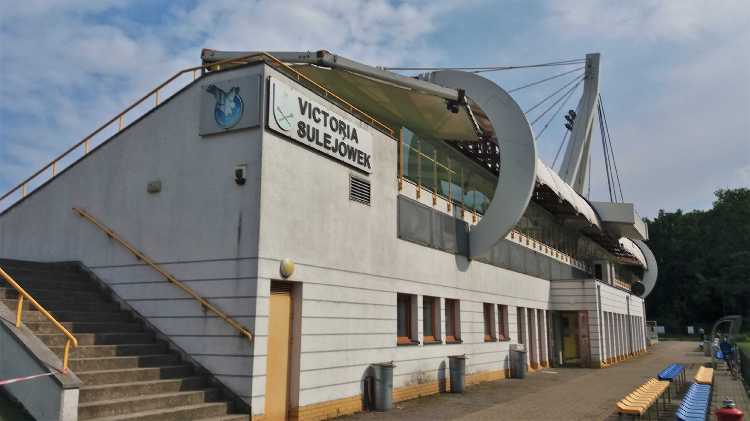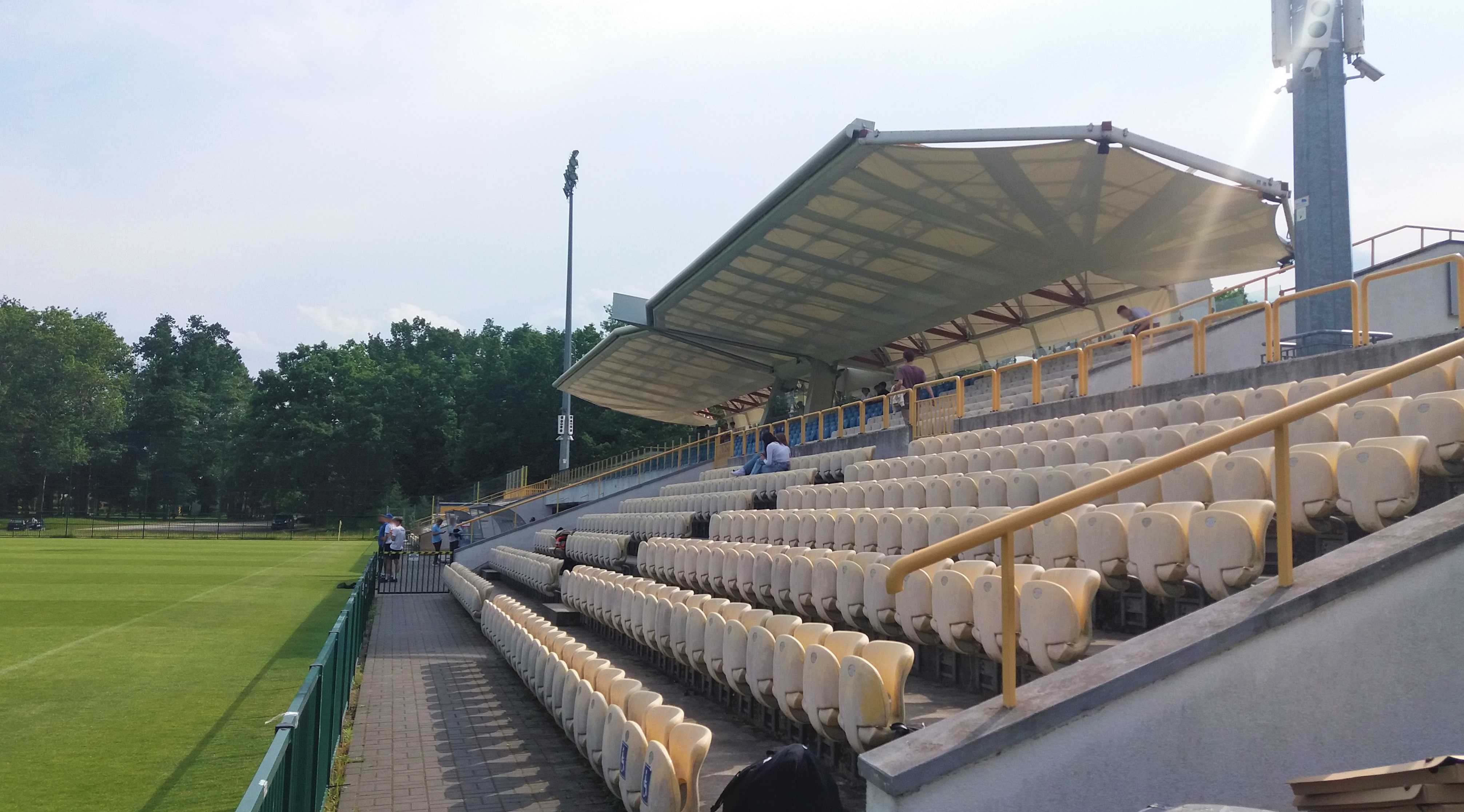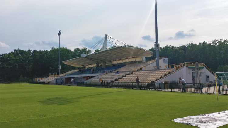 |  | | Trybuna stadionu w Sulejówku widziana zza ogrodzenia | |