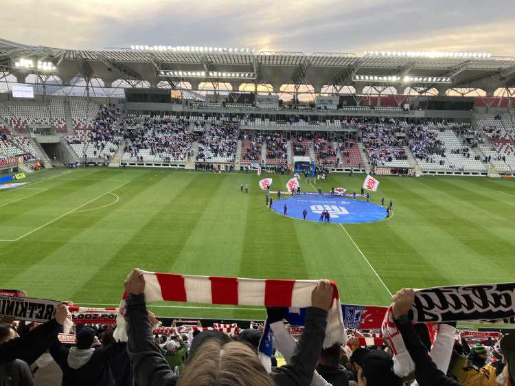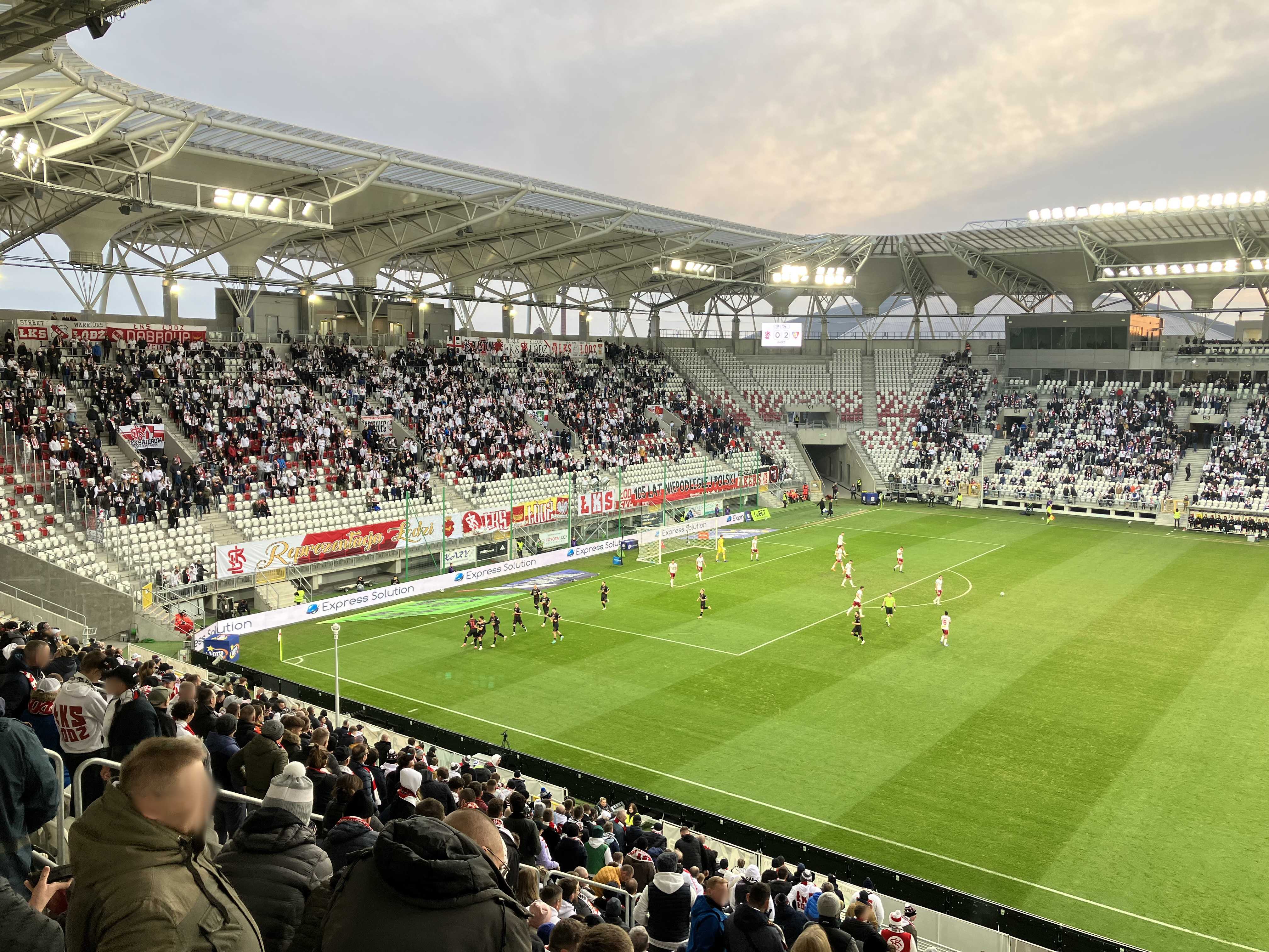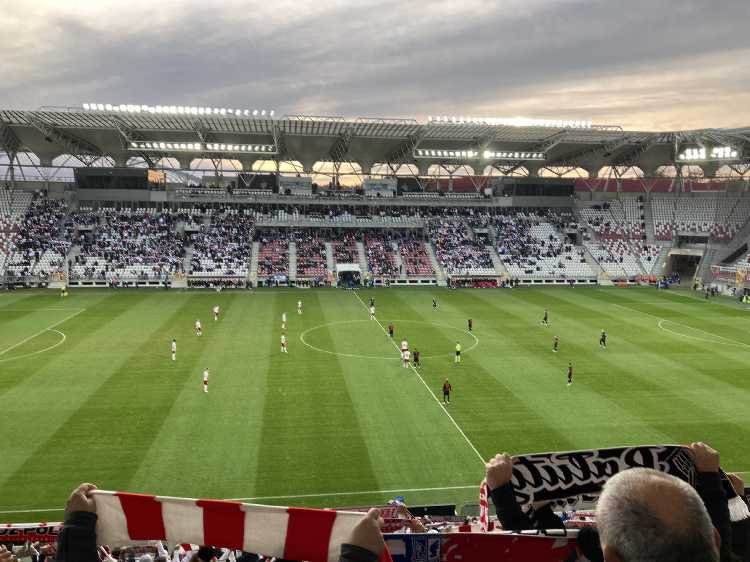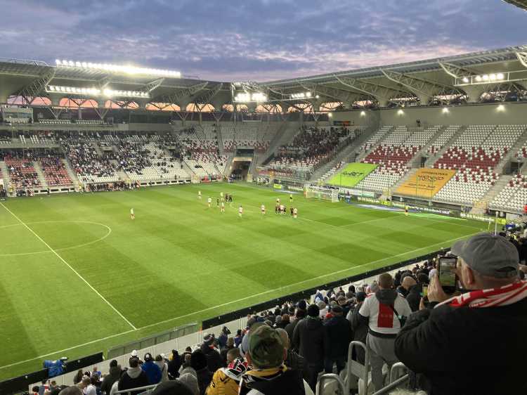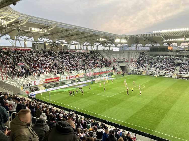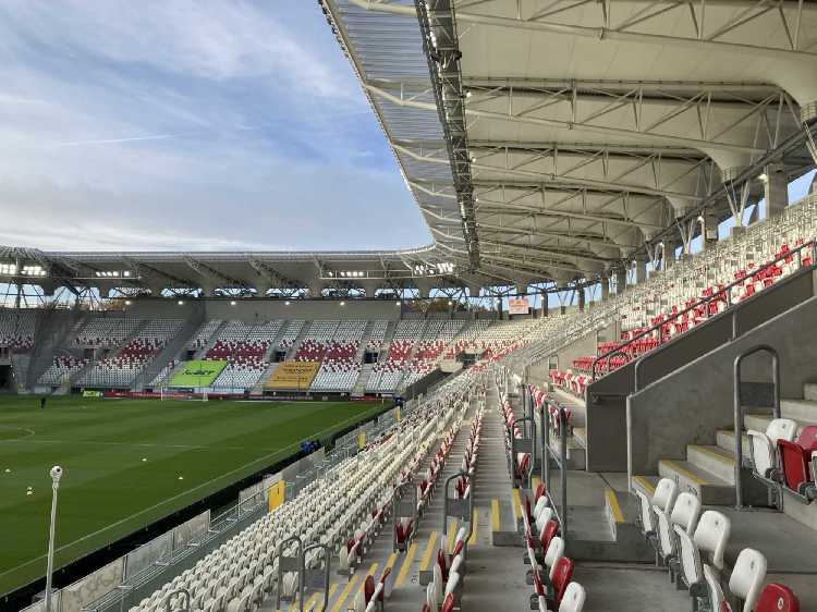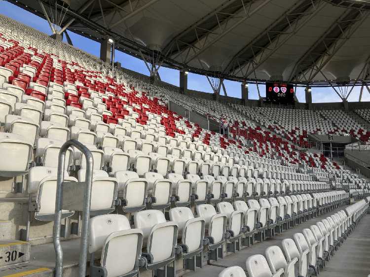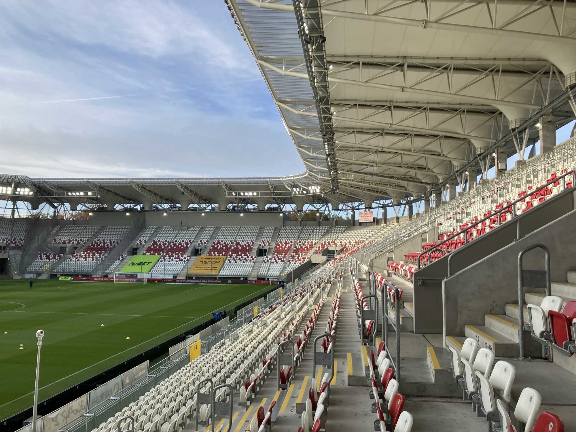 |  | | Na wysokich rzędach na trybunach znajdują się dodatkowe barierki, zabezpieczające przed wypadnięciem (?) | |