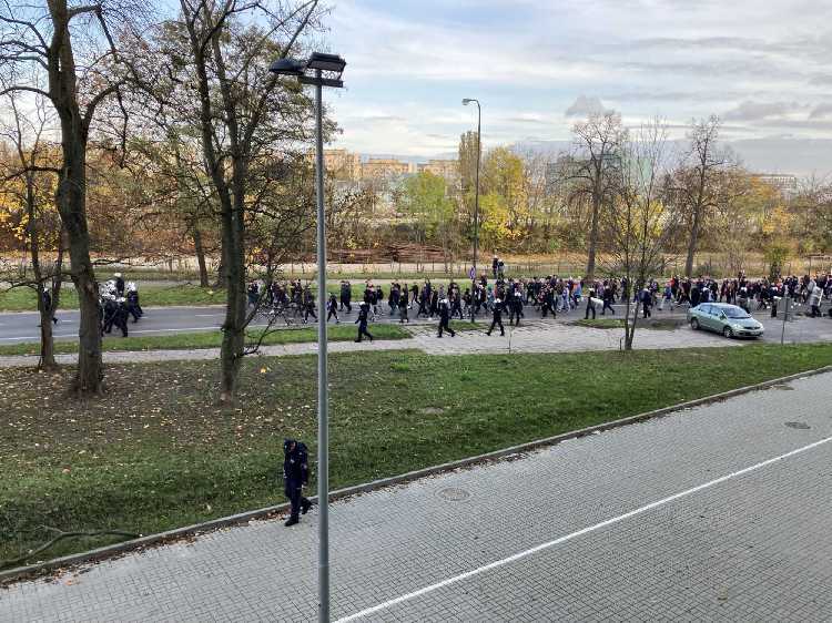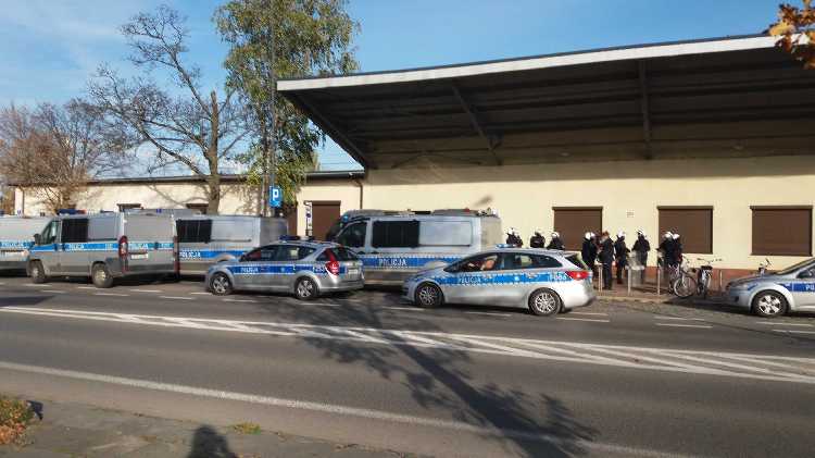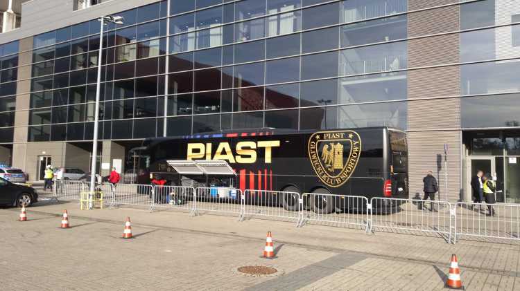 |  | | Zastępy Policji czekające na przyjazd kibiców Piasta | |