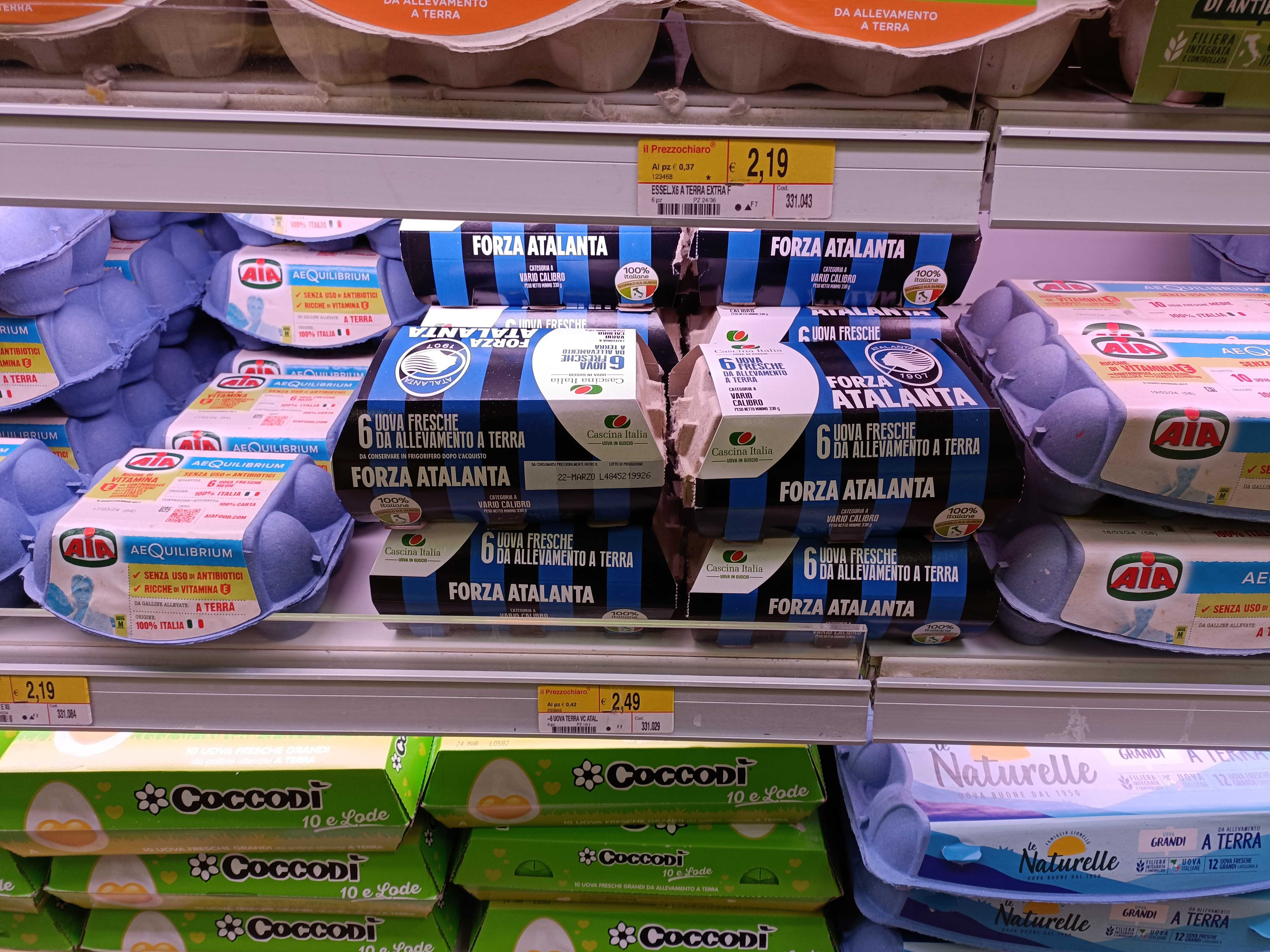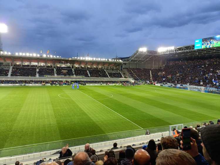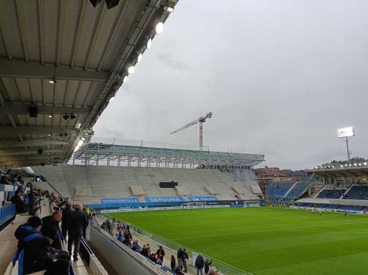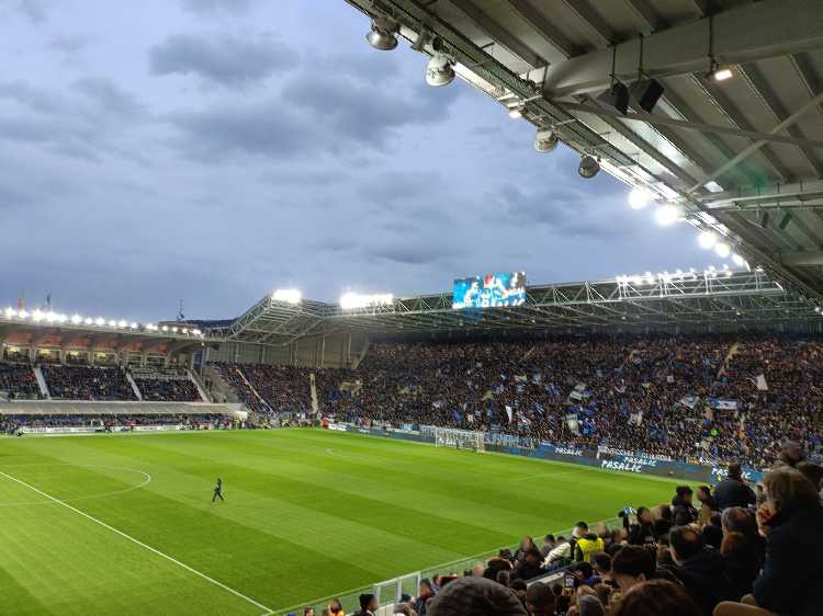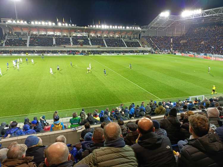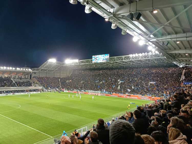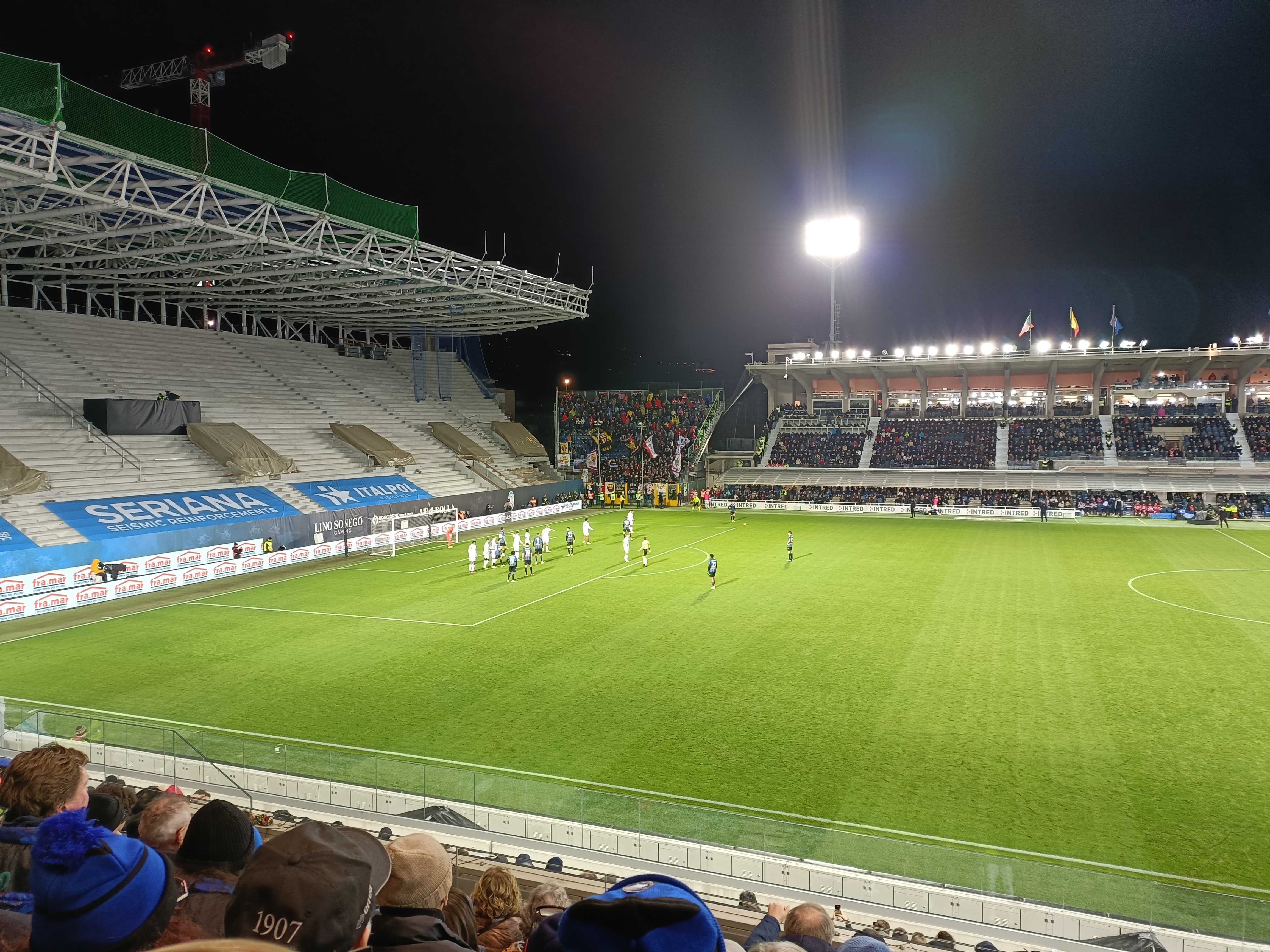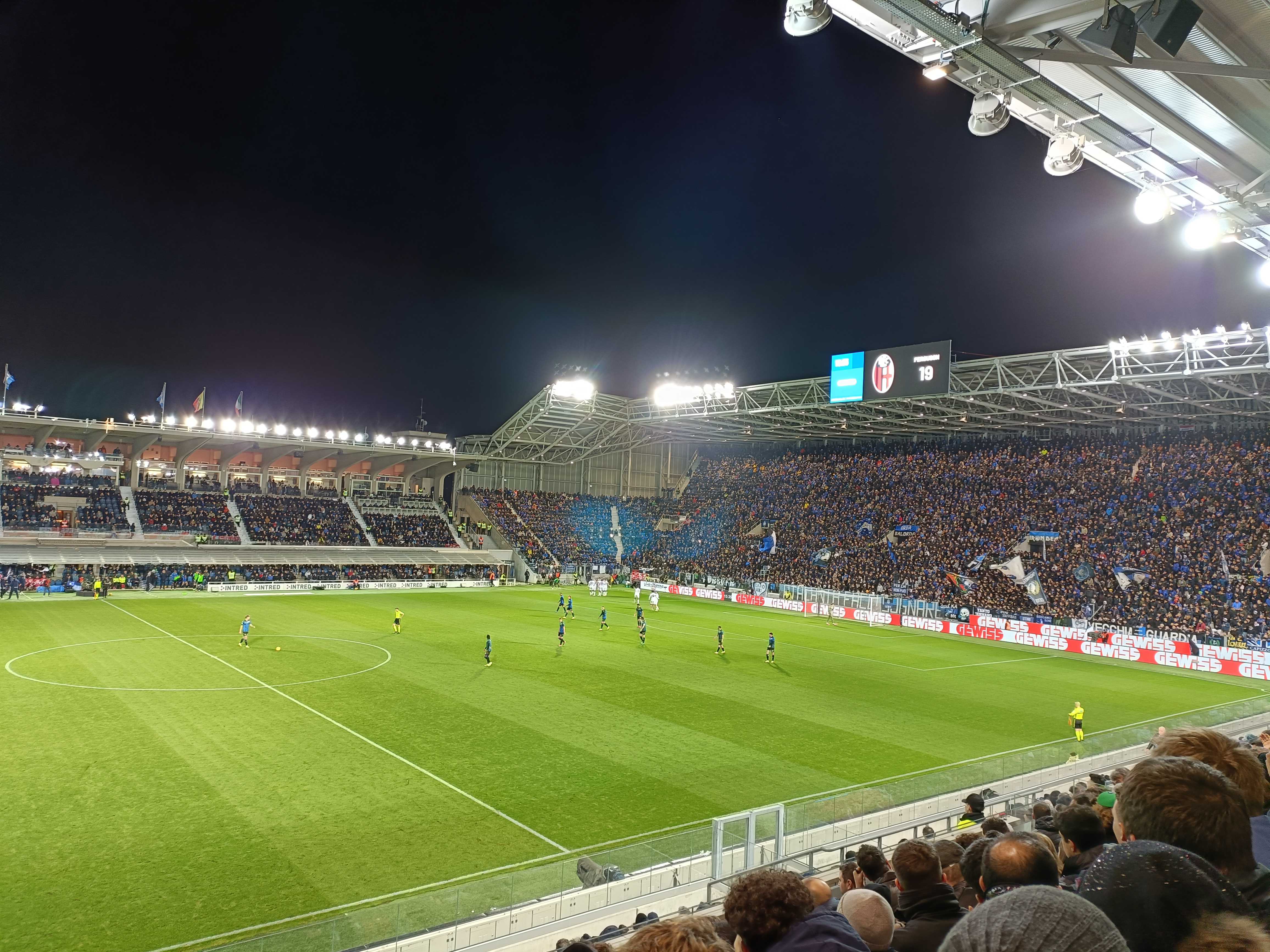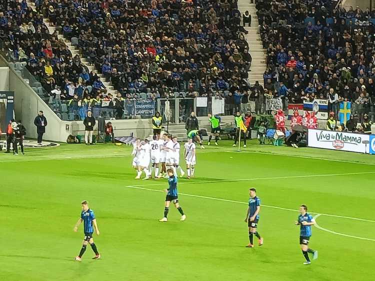 |  | | Piłkarze Atalanty walą głową w mur; przy okazji, widać kibiców gości w swoim sektorze | |