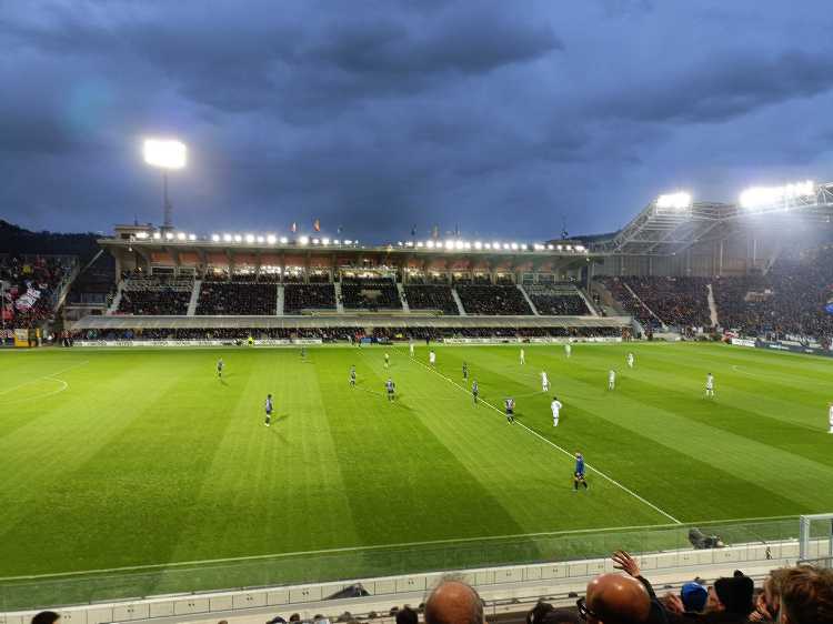 |  | | Widok nie najgorszy, chodciaż trybuna nie jest tak blisko od boiska jak mogłaby być (to chyba pozostałość po bieżni) | |