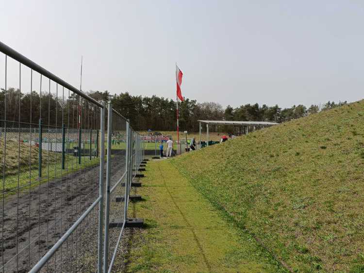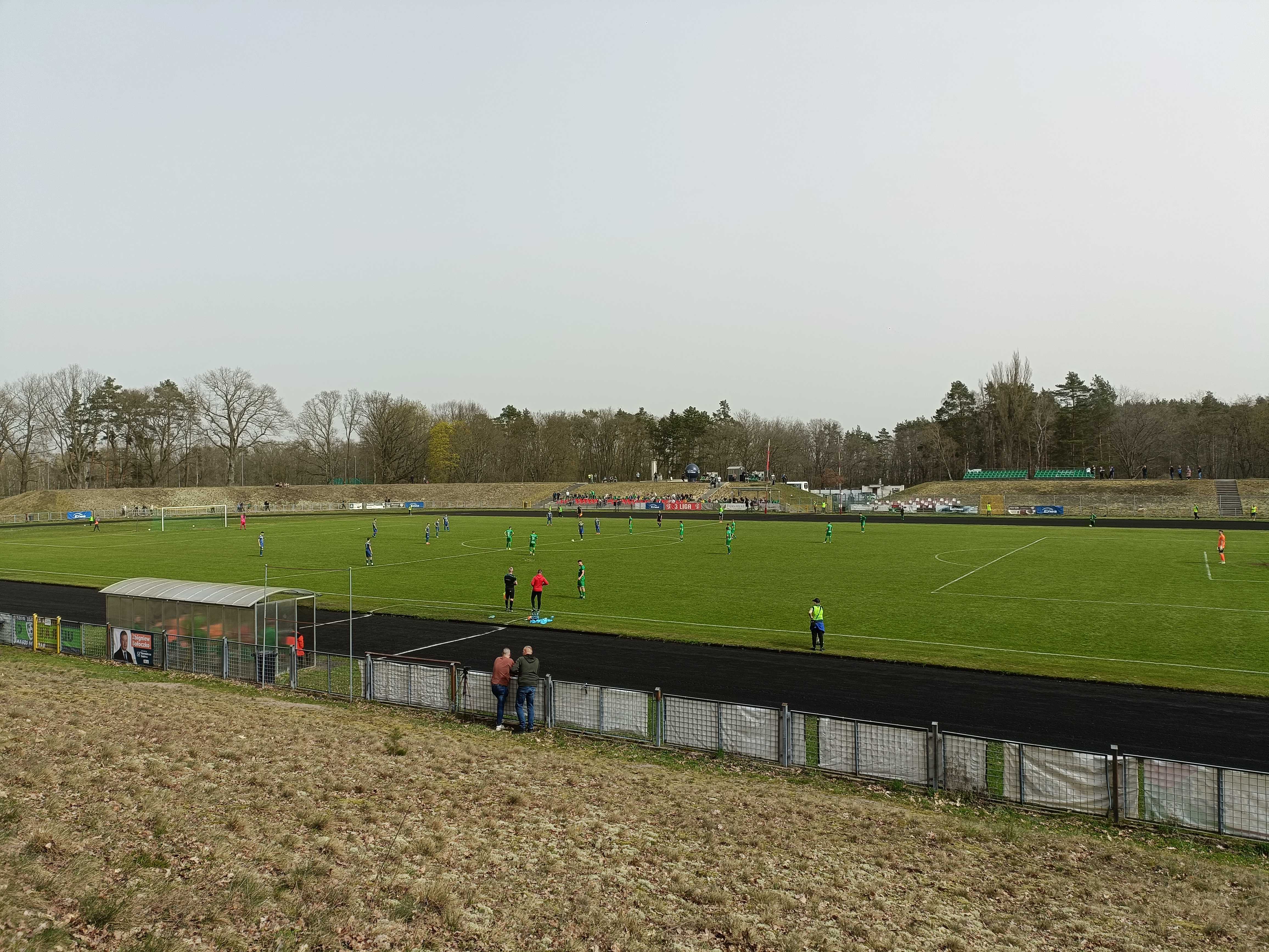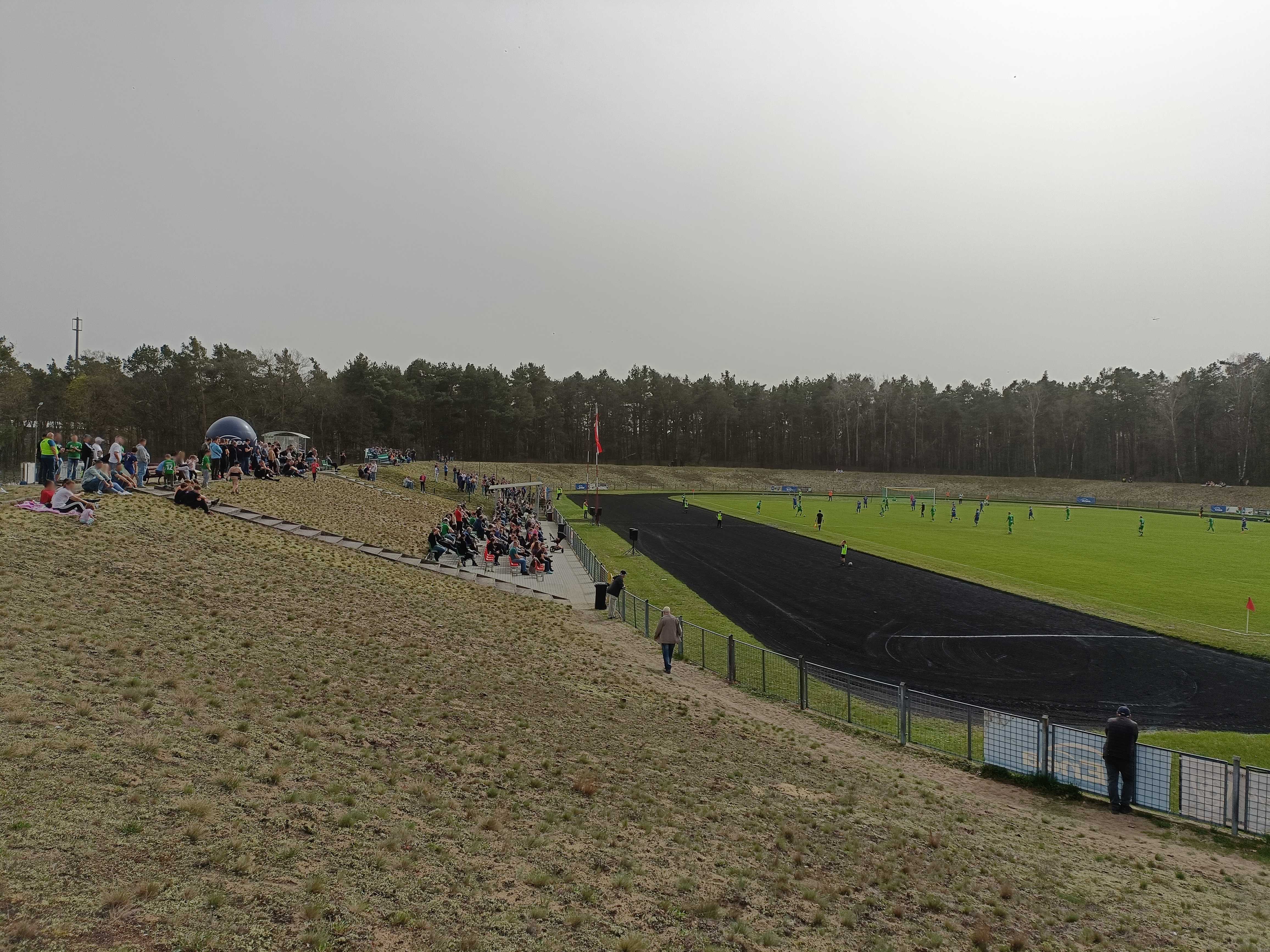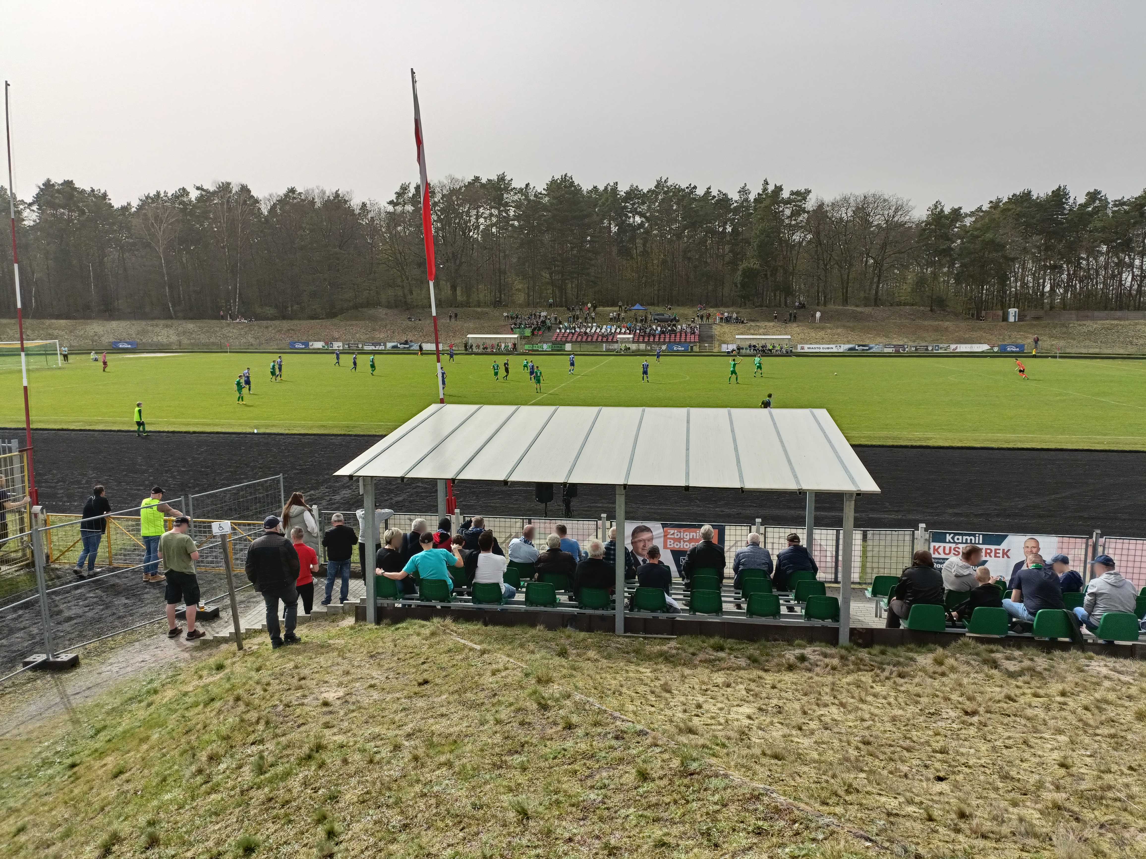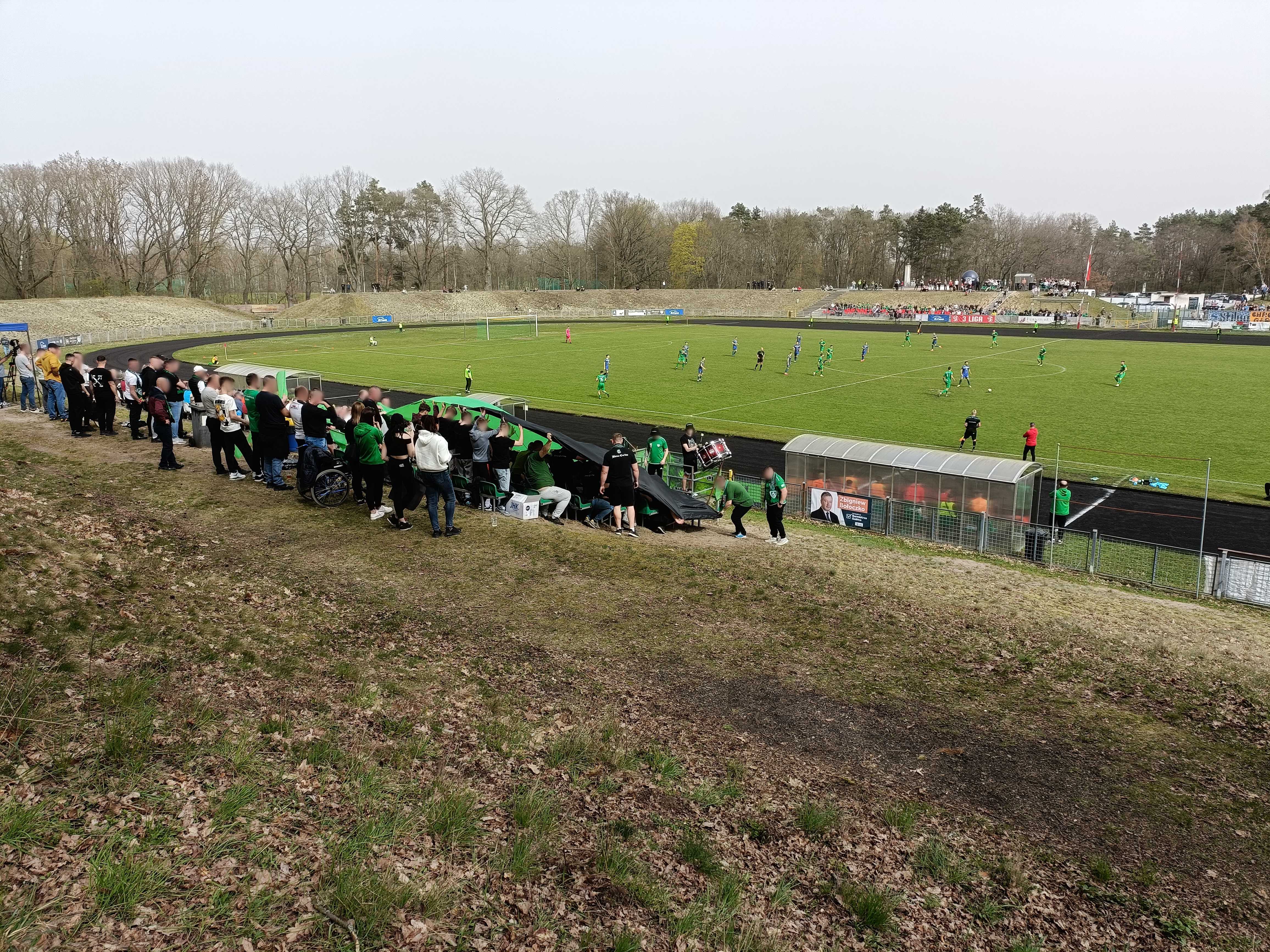 |  | | Kibice kryją się pod sektorówką, co wygląda dość pociesznie na takiej małej trybunce | |