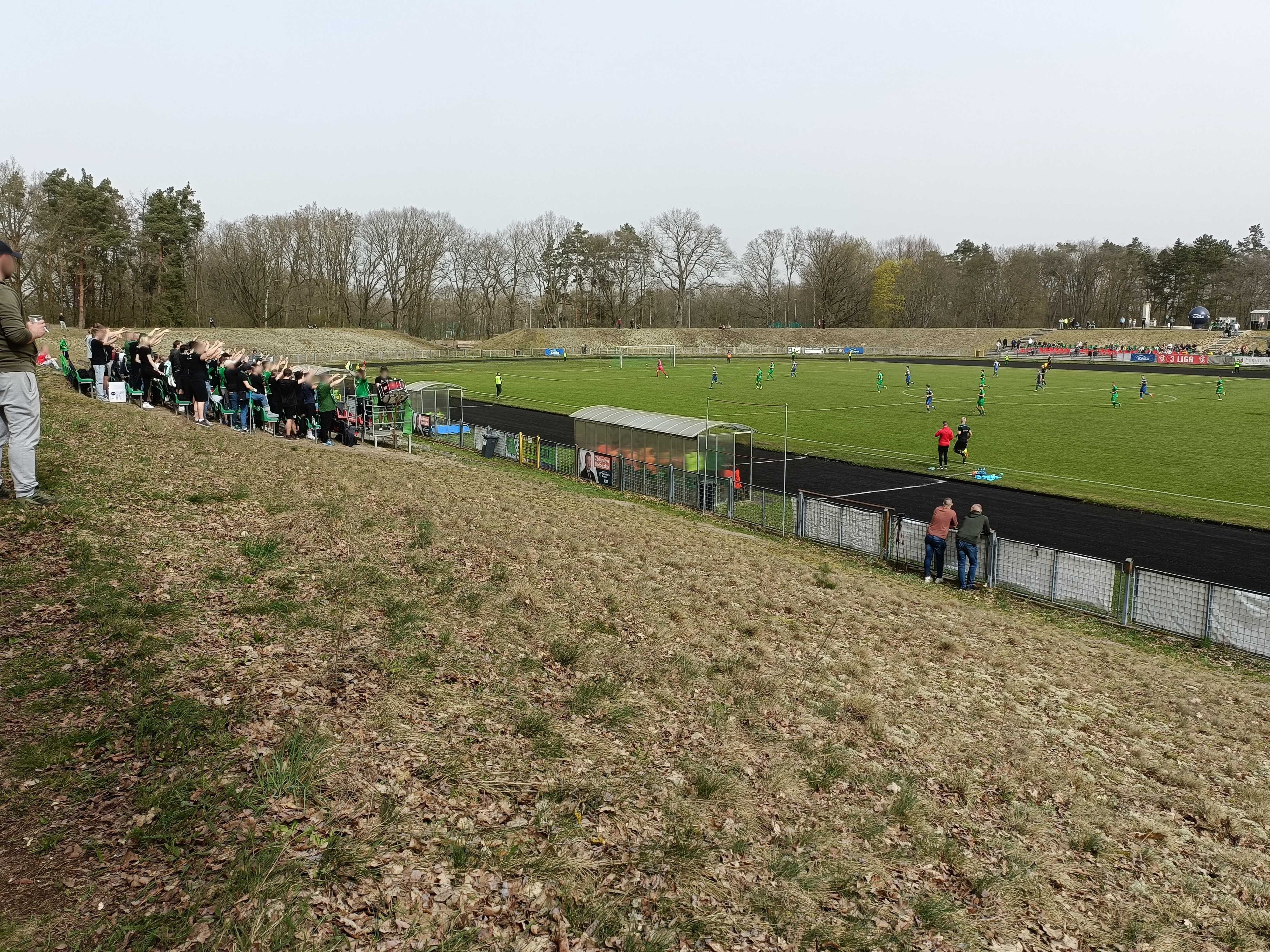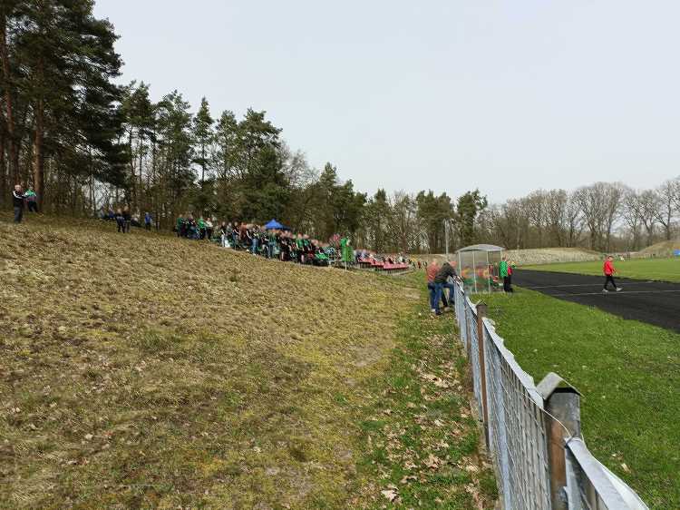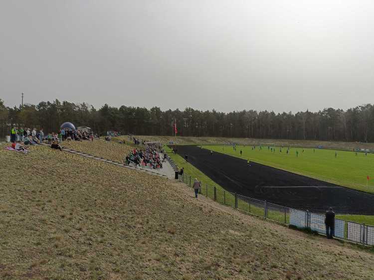 |  | | Trybuna wschodnia - zdjęcie bardzo dobrze unaocznia jak daleko jest z trybun (szczególnie ze szczytu wału) do linii bocznej boiska | |