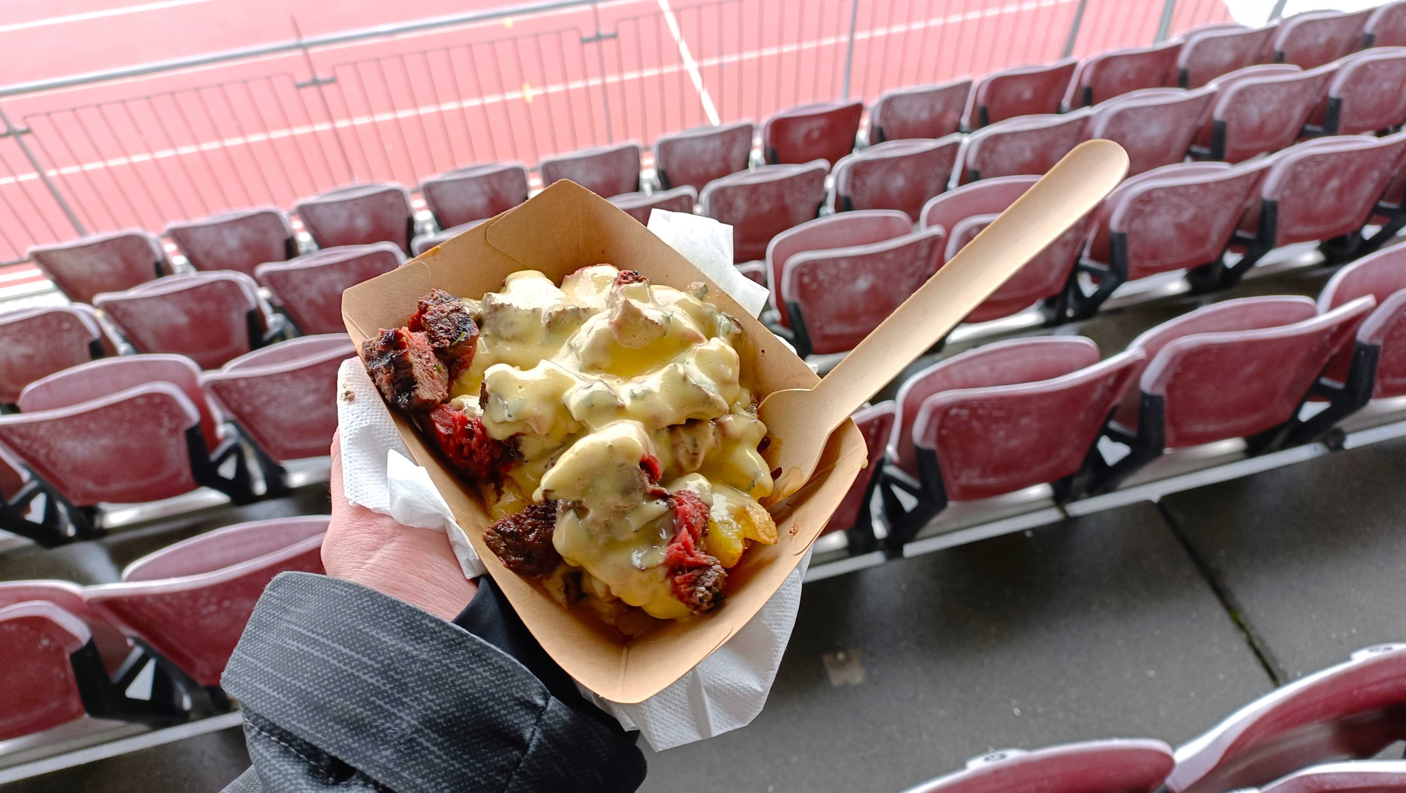 |  | | Ciekawy posiłek stadionowy (kawałki steka wołowego, frytki i sos) | |