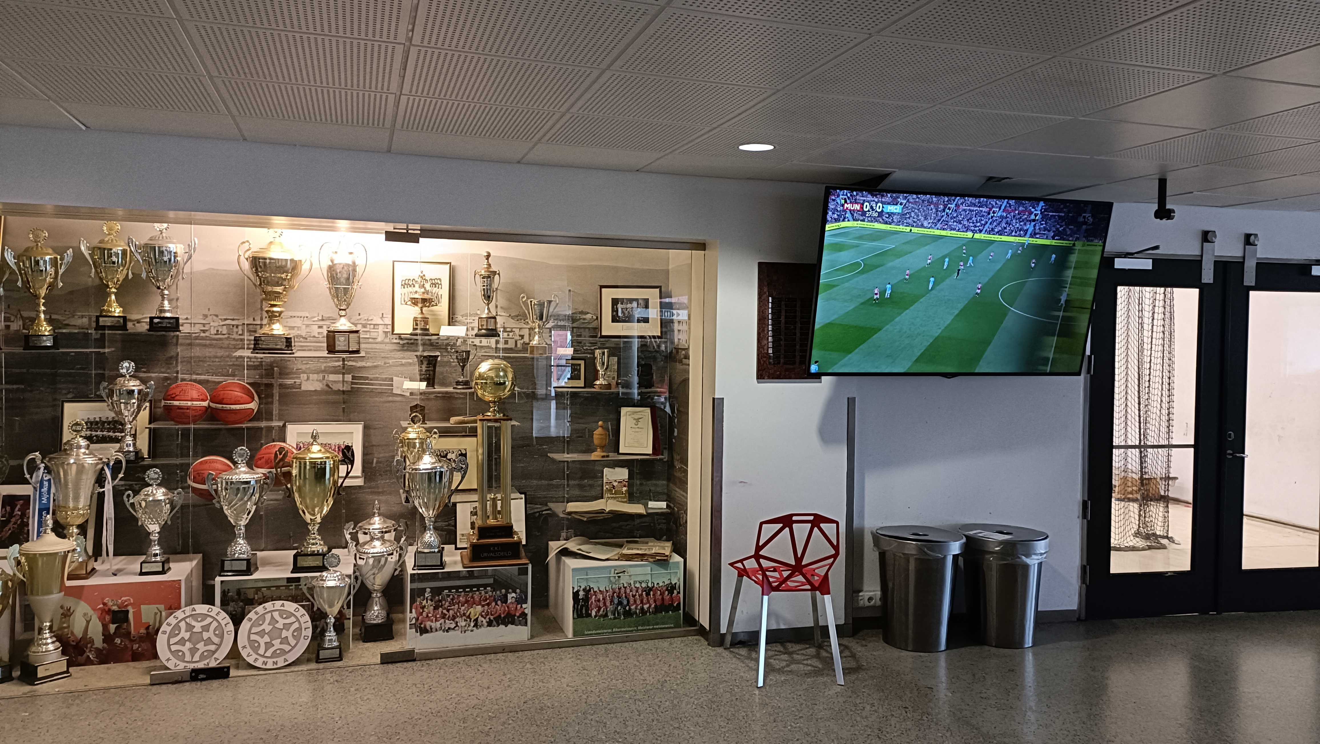 |  | | Po końcowym gwizdku do odjazdu autobusu miałem jeszcze 20 minut, więc wraz z grupą Islandczyków zasiadłem do oglądania Derbów Manchesteru (obok gablota z valurowymi trofeami) | |