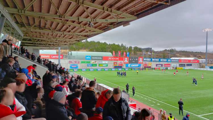 |  | | Druga połowa - piłkarze gości (oraz grupka kibiców na trybunie) świętują gola na 1:0 | |