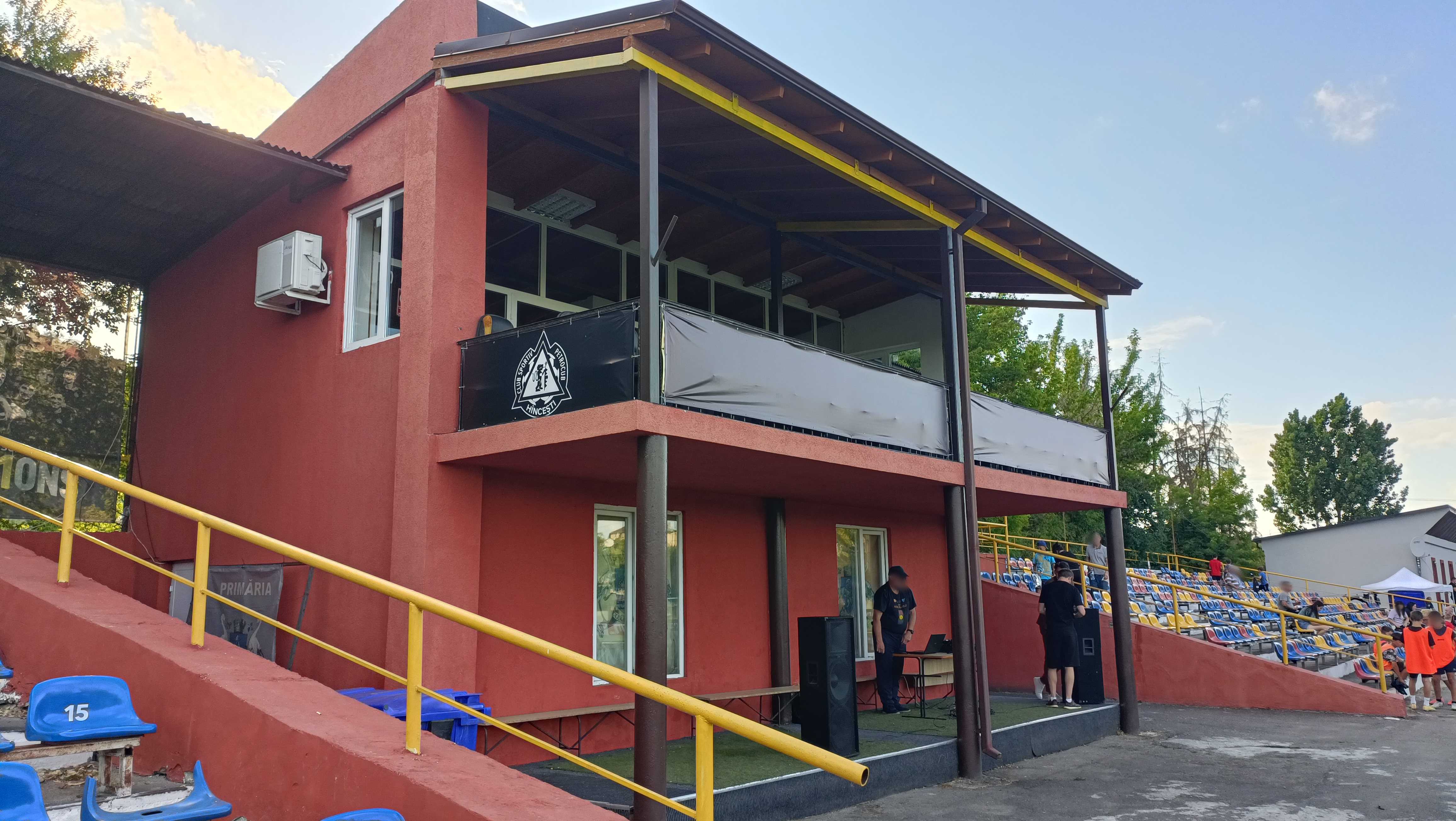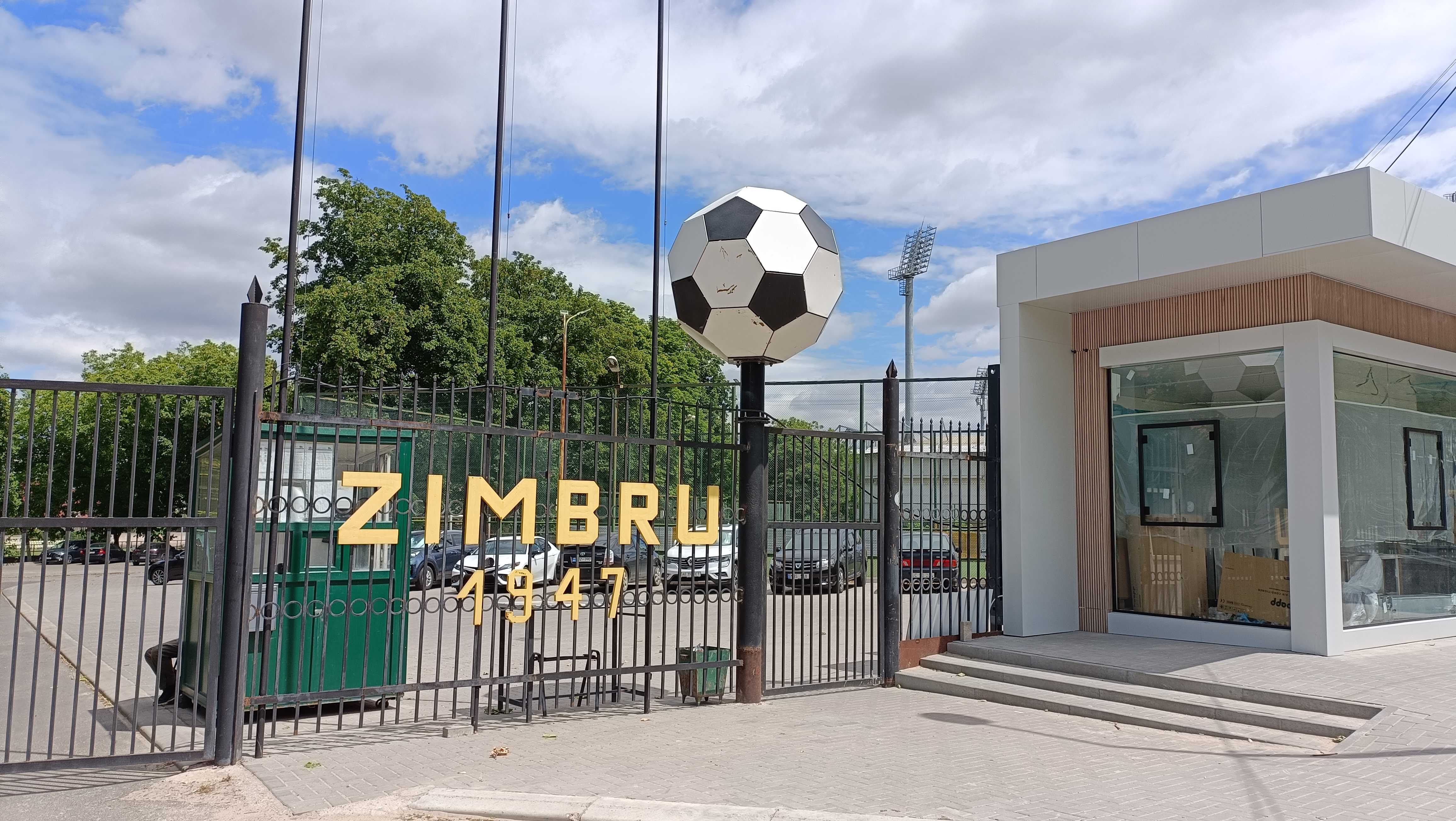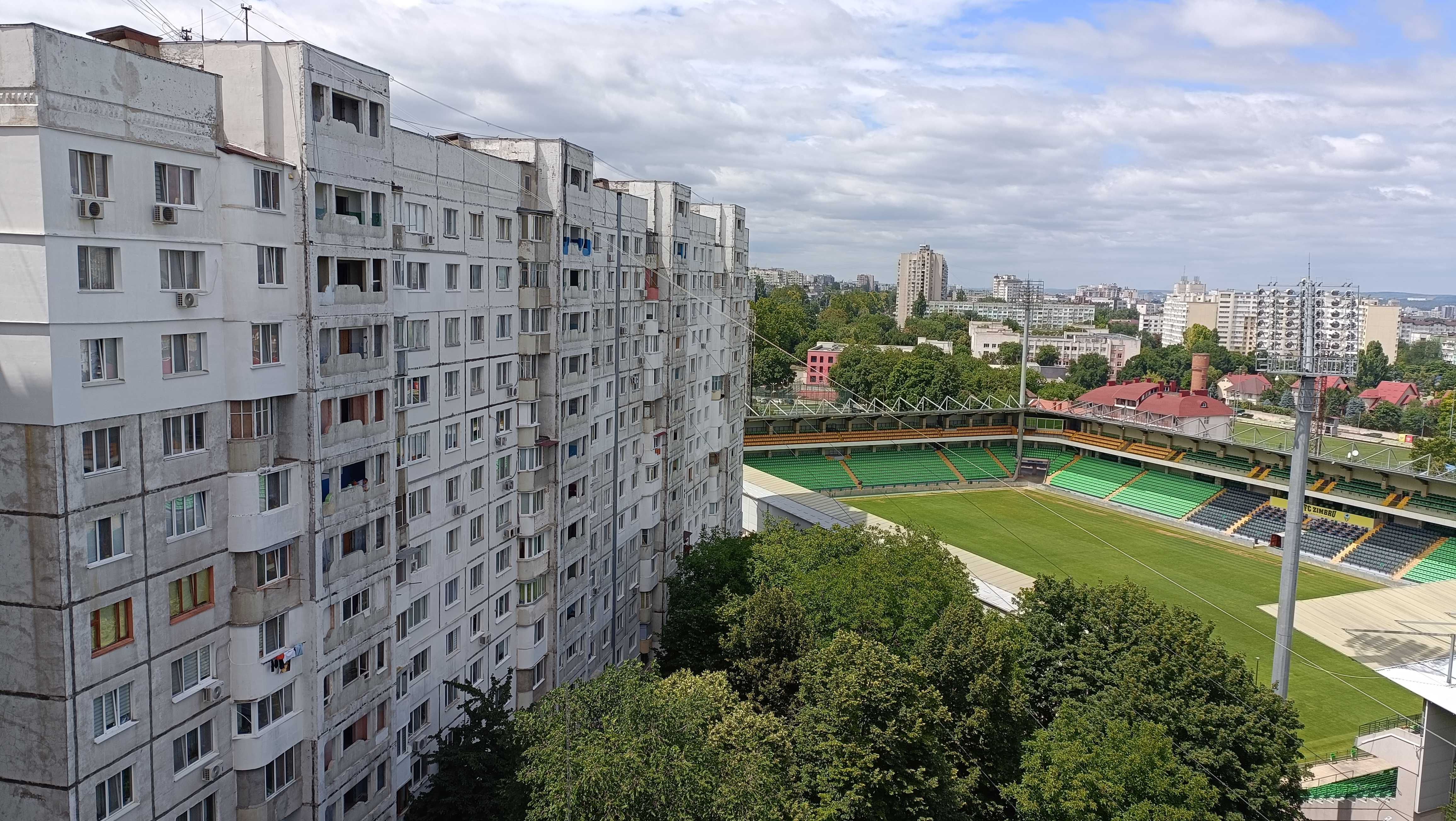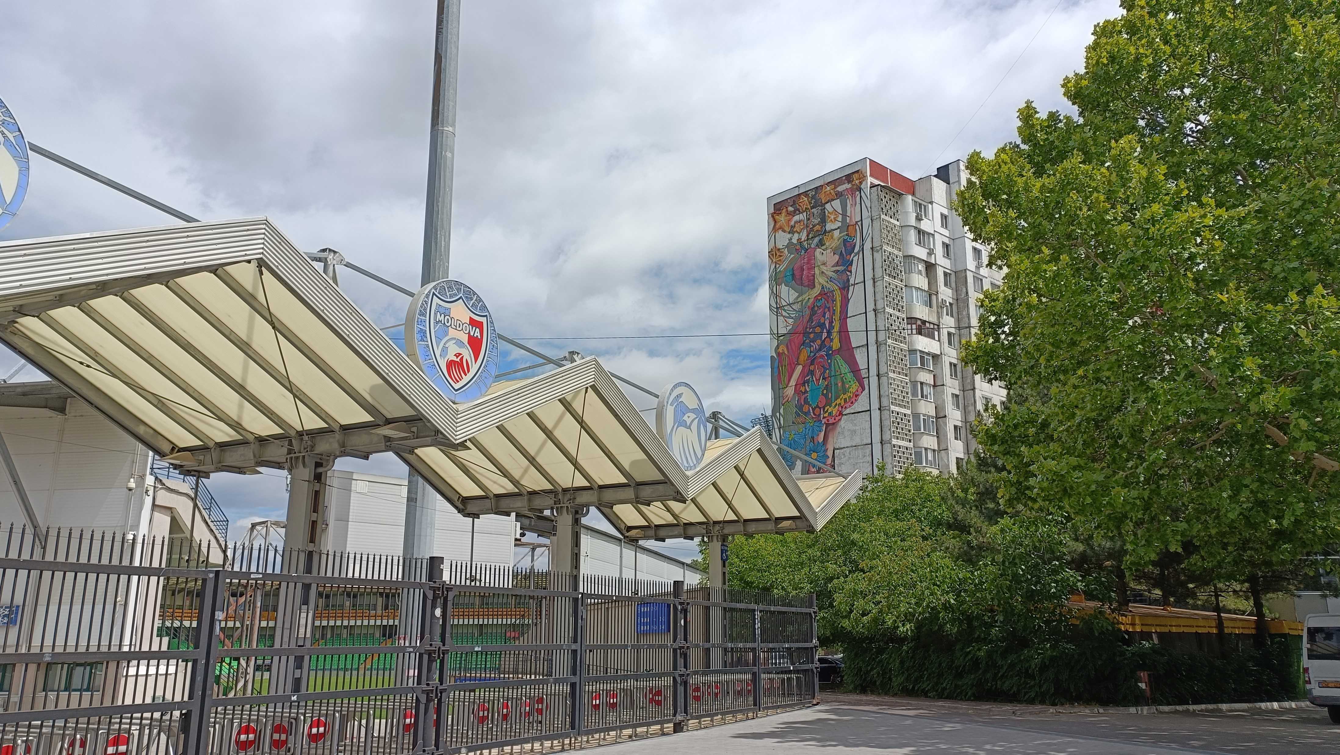 |  | | Główne wejście na Stadionul Zimbru, a w tle legendarne blocuri | |
