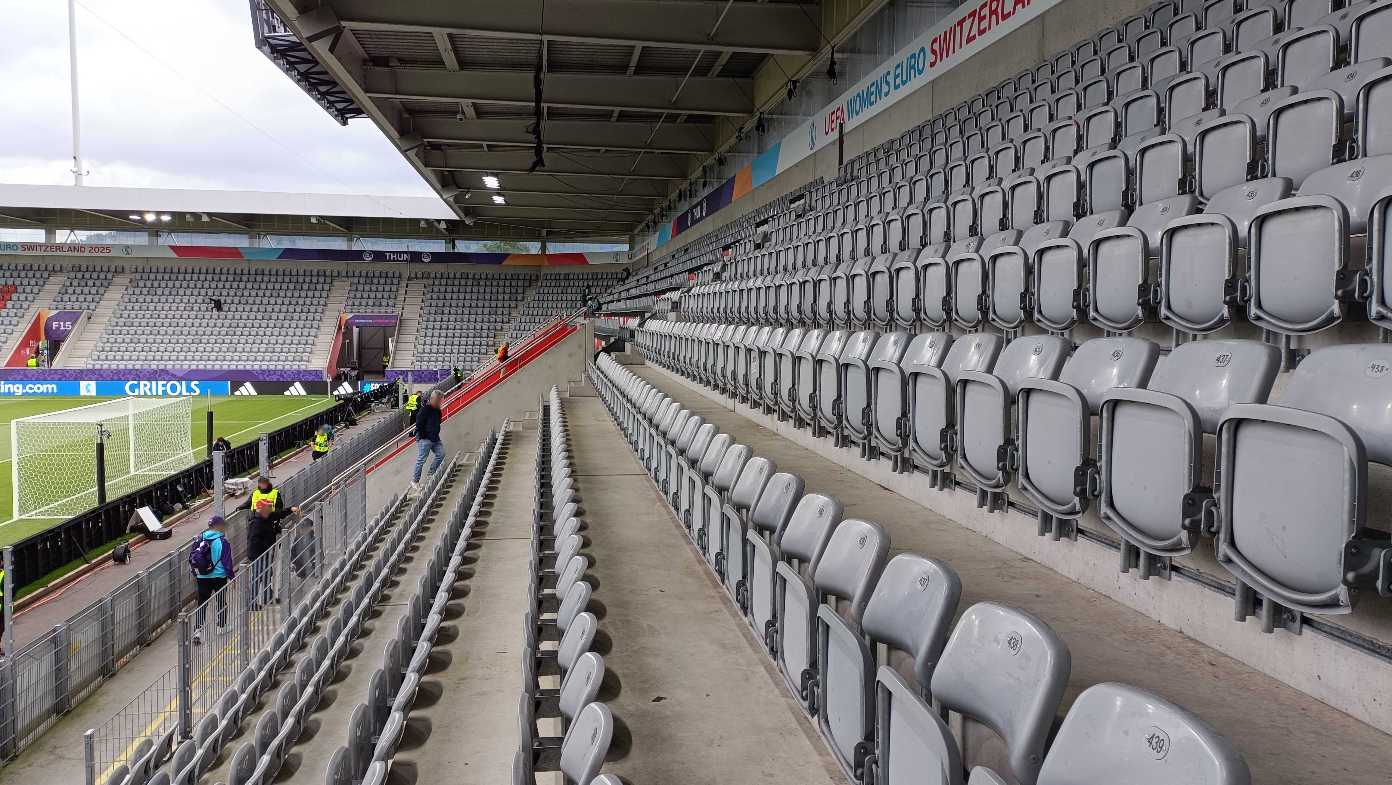 |  | | Tymczasowo zainstalowane metalowe siedzenia na stojącej trybunie zabramkowej | |