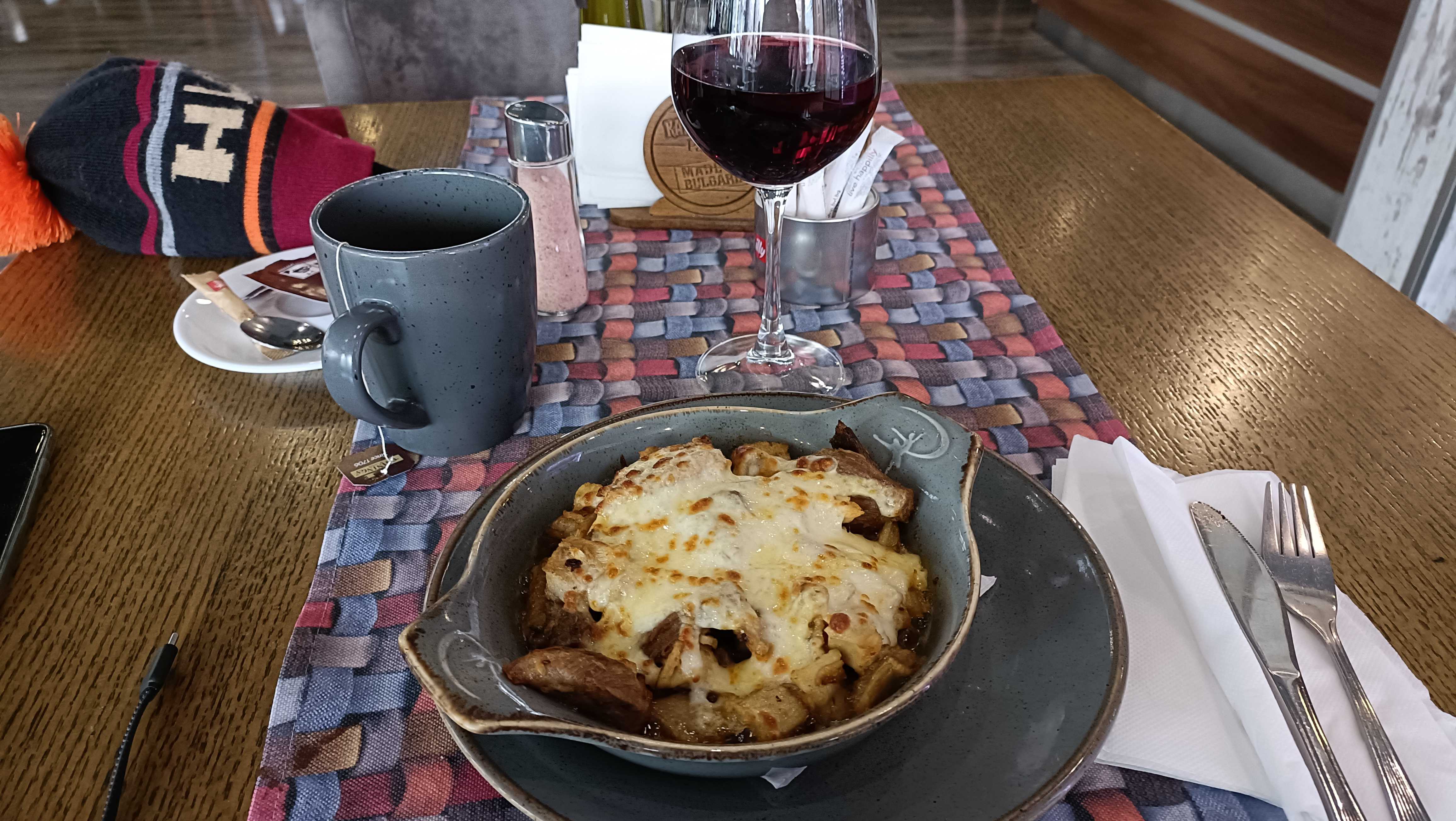 |  | | Improwizowane danie, które nazwałem bułgarskim miszmaszem - zapiekanka złożona z flaków, bułgarskich grzybów, ozorów i sera kaszkawał, wszystko podane w skwierczącym tłuszczu | |