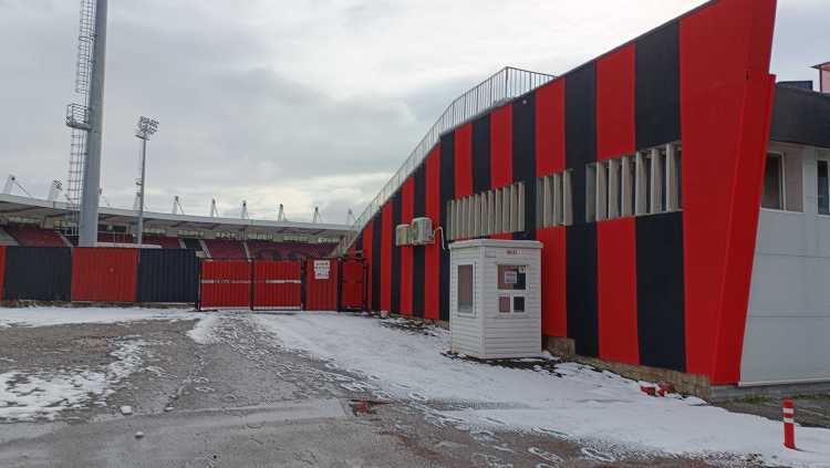|  | | Zdjęcie stadionu zrobione znad betonowego ogrodzenia | |