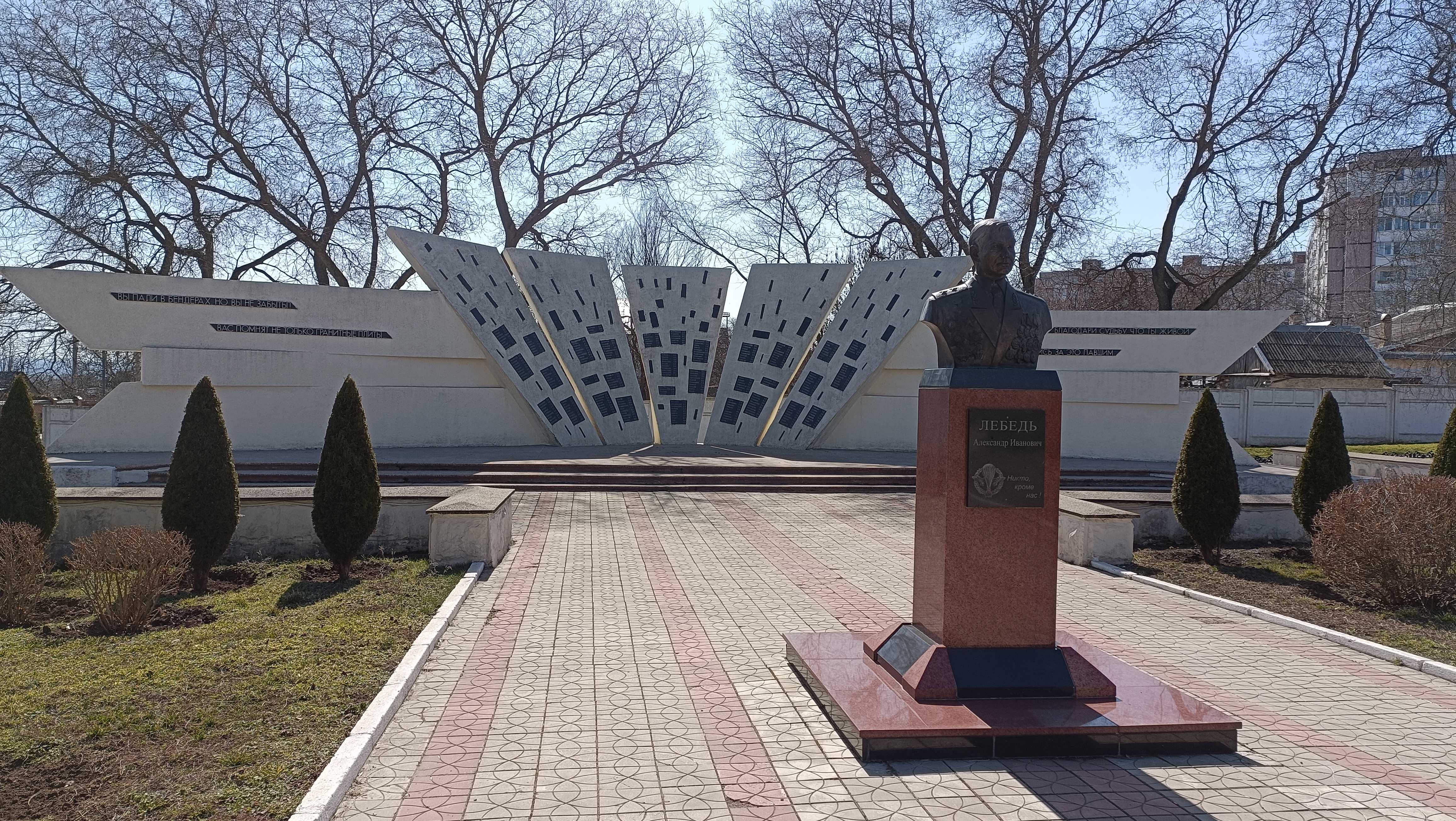 |  | | O ile konflikt zbrojny między Naddniestrzem a Mołdawią w 1992 roku miał w sobie wiele elementów absurdalno-komediowych, o tyle w Benderach nie ma się z czego śmiać, bo miały tu miejsce krwawe walki, w których zginęły setki cywili - i to ich upamiętnia ten pomnik. Z przodu popiersie generała Alieksandra Lebiedzia - postaci odbieranej w Naddniestrzu jednoznacznie dobrze | |