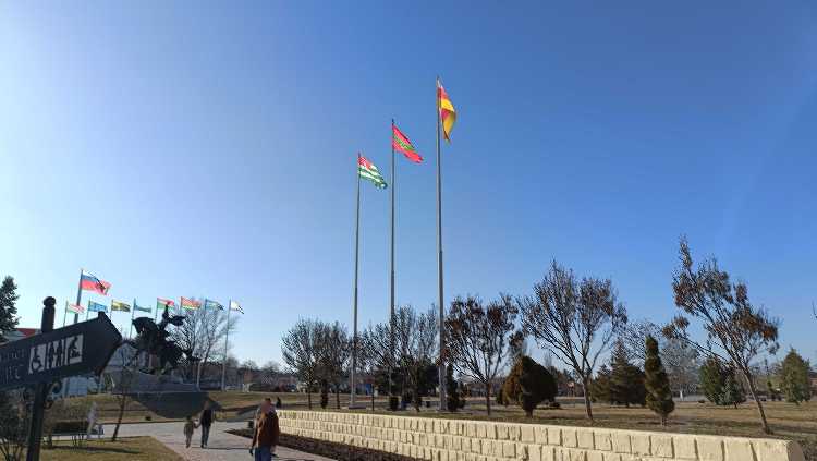 |  | | A tutaj już przechodzimy do zwiedzania Tyraspola - na zdjęciu widzimy trzy maszty flagowe, z flagami Abchazji, Osetii Południowej i Naddniestrza. Na dalszym planie widać kilka flag najważniejszych miast Naddniestrza, a także dwie flagi, które mają w Naddniestrzu równorzędny status - flaga państwowa oraz... flaga Federacji Rosyjskiej. A, gdzieś w tle widać również pomnik Alieksandra Suworowa - jest to gest wdzięczności za rzeź Pragi założenie miasta Tyraspol. | |