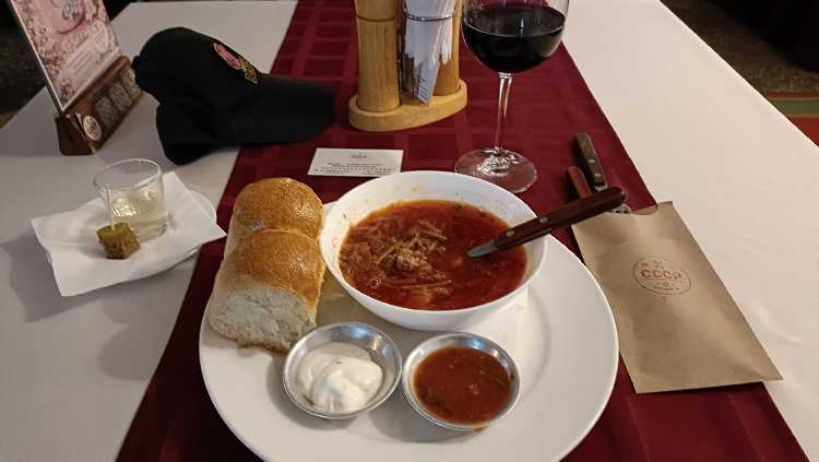 |  | | Spożywam w restauracji obowiązkowy barszcz; po lewej stronie gratis, tzw. ugoszczenie | |