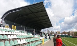 Za bramką znajduje się trybuna Południowa, która, o ile dobrze policzyłem krzesełka, liczy 840 miejsc. Każde krzesełko było numerowane, więc najłatwiej byłoby mi po prostu znaleźć najwyższy numer na trybunie, problem jednak w tym, że trybuna była zamknięta (przy okazji, krzesełka na Zachodniej też były numerowane w ten sposób - ja miałem na swoim bilecie miejsce numer 500-coś). Nieopodal tej trybuny, od strony Kauflanda wschodu, znajduje się klatka gości, dla których przeznaczono jakieś 150 miejsc. Z prostego rachunku (bo wszystko ma sumować się do oficjalnej liczby 2100 miejsc siedzących) wynika, że trybuna Zachodnia liczy jakieś 1100 miejsc.