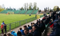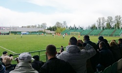 Łowicz jest piłkarskim miastem. W Internetach znalazłem informację, że parę tygodni wcześniej na meczu Widzew-Pelikan na stadionie pojawiło się prawie 700 fanów z Łowicza... z czego przeważająca większość w barwach czerwono-biało-czerwonych. Na domowym meczu Pelikana z Lechią TM stawiło się ok. 300-350 osób, ale skład osobowy chyba znacznie różnił się od tamtej grupy wyjazdowej, ponieważ intensywność dopingu była adekwatna do pory rozgrywania spotkania (niedziela, 11:15). Trybuny ograniczały się do spontanicznego pokrzykiwania na piłkarzy i głośnego komentowania pracy sędziego (Zdrów jak koń! padło z trybun, kiedy po jednym z fauli podniósł się z boiska Kamil Szymczak). W zasadzie na trybunach nie działo się nic ciekawego, poza sporadycznymi zrywami w drugiej połowie, kiedy zgromadzeni widzowie zaczynali krzyczeć Pelikan! Pelikan! . Wodzirejem w takich sytuacjach był pewien emeryt, który z władczością pokazywał rękami poszczególnym sektorom kto ma jak śpiewać, co wyglądało trochę zabawnie. Ale gdyby nie on, elementy dopingu na trybunach chyba zanikłyby całkowicie.