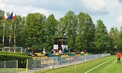 Po przejściu przez bramę główną należało dojść na trybunę. Ze względu na to, że droga od niezbyt dużego budynku klubowego na boisko była odgrodzona barierkami, droga na trybunę wiodła za budynkiem - zaplecze budynku klubowego było niezbyt efektowne, ponieważ szło się zwykłą ścieżynką, wśród krzaków i gruzu. Na stadionie znajdowały się trzy sektory - trybuna główna składała się z trzech rzędów zielono-żółtych krzesełek ciągnących się wzdłuż linii bocznej. Na środku sektora znajdowała się blaszana zadaszona budka spikera stadionowego. Naprzeciw tej trybuny znajdował się niewielki sektor z dwoma rzędami krzesełek, ciągnący się od linii końcowej boiska do pierwszej ławki rezerwowych, a także niewielki ogrodzony sektor gości, na który składało się 30 betonowych miejsc stojących (właśnie, to mnie zawsze zawsze zastanawiało - po co krzesełka na sektorze gości?). Ze względu na pojemność sektora gości, stawiam, że cały stadion liczy 600 miejsc.