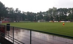 Na Legionovii doping czasem jest, a czasem nie. Tym razem trafiliśmy mecz bez dopingu – atmosfera na trybunie była mocno piknikowa, a zgromadzeni na stadionie widzowie zajmowali się po równo oglądaniem meczu jak i wzajemnymi rozmowami (ja i Q rozprawialiśmy na temat przeróżnych sportów, a czasem przeplatałem to objaśnianiem sensu podstawowych piłkarskich zwrotów jakie dochodziły z boiska, takich jak „plecy”, „czas”, „żyjemy”, czy… „wypierdalać”). Gol dla Novii wyzwolił jednorazowy aplauz na trybunach, na fali którego ktoś zaintonował „Legionovia, Legionovia”, co zostało przez chwilę pociągnięte. Natychmiastowa odpowiedź Znicza wywołała z kolei nieco głośnych i szyderczych komentarzy pod adresem Dominika Puska. Generalnie, wśród gospodarzy panował piknik. Co innego goście, którzy raz na jakiś czas raczyli swoich piłkarzy przyśpiewkami. Przyśpiewki nie miały wielkiej mocy, ponieważ goście stawili się na meczu w liczbie max. 5 osób. Ale i tak brawo za zajawkę.Na trybunie Legionovii znajdowały się flagi gotowe do wymachiwania nimi, a z zasłyszanych przez nas rozmów wynikało, że w drugiej połowie rzeczywiście coś będzie się działo. Plany dopingowe mocno pokrzyżowała jednak pogoda, ponieważ w przerwie meczu nagle spadł deszcz. Ciężko jednak zobrazować słowami, jak ten deszcz wyglądał. Była to po prostu kaskada wody, która utrzymywała się nad Legionowem przez całą drugą połowę (za to ustała wraz z końcowym gwizdkiem, aby dało się bez problemu wrócić z meczu – ktoś na górze dobrze to przemyślał). W związku z tym na trybunach nastąpiły roszady, ponieważ wszyscy schowali się pod dachem. Wszyscy oprócz nieszczęsnych kibiców gości, którzy musieli pozostać w swoim niezadaszonym sektorze. Próbowali się co prawda zadaszyć przy pomocy swojej flagi „Young Boys ’16”, ale na niewiele się to zdało (próbowałem uwiecznić to, opuszczając na chwilę zadaszony sektor i wchodząc w strefę deszczu niczym wojenny fotoreporter, ale biorąc pod uwagę jakość sprzętu, jakim dysponowałem, mój fotoreportaż wyszedł bez szału). Pomimo tego, w drugiej połowie śpiewali oni dużo więcej i z dużo większym entuzjazmem niż wcześniej. Napiszę więc jeszcze raz, brawo za zajawkę.