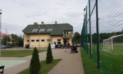 Na sam stadion składa się piętrowy budynek klubowy, boisko oraz jedna trzyrzędowa trybuna, oczywiście biegnąca wzdłuż linii bocznej. W hallu budynku klubowego można skorzystać z automatu z przekąskami (z toalety też, ale wejście jest na tyłach budynku), lub też obejrzeć trofea młodzieżowych drużyn Józy oraz wiszące na ścianie proporczyki różnych jej przeciwników (zastanawia mnie, skąd wzięło się tam Zagłębie Lubin – z całym szacunkiem do Józefovii). Moją uwagę przykuła przede wszystkim gablotka, w której znajdowały się przykładowe pamiątki Józy, takie jak kubek, czy szalik. Niestety, tego dnia nie dało się kupić żadnej pamiątki (ponoć nie było odpowiedniej osoby, która może się tym zająć); trudno, spróbuję innym razem. Naprawdę było mi szkoda, ponieważ kubek MLKS Józefovia to naprawdę byłoby coś.