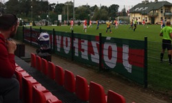 Na meczu stawiło się około 100 widzów (przy czym szacuję, że było ich jednak nieco więcej niż 100). Zasiadali oni głównie na trybunie, jednak niewielka grupka obserwowała mecz również zza bramki, stojąc przy budynku klubowym. Kilka osób znajdowało się również na „loży”, tzn. na balkonie budynku klubowego.