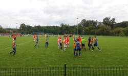 Pierwsza połowa rozpoczęła się od mocnego uderzenia Józefovii – przeprowadziła ona parę naprawdę groźnych akcji, jednak albo brakowało szczęścia, albo na drodze stawał im bardzo dobrze dysponowany bramkarz Konstancina. Szyki gospodarzom dość mocno pomieszała sytuacja z ok. 15. minuty meczu, kiedy po faulu gracza Józy wywiązała się duża przepychanka, w wyniku której Kopeć został ukarany czerwoną kartką, co wywołało aplauz wśród piłkarzy gości. Nie widziałem dokładnie za co gracz Józy dostał czerwo, ale wierzę sędziemu „na słowo”. Po kilku minutach miała miejsce podobna sytuacja, tyle że tym razem faulował gracz KS-u. W kolejnej przepychance tym razem chamstwem wykazał się gracz Konstancina (odepchnął rywala), ale został ukarany jedynie herbatnikiem.