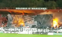 Jeśli chodzi o flagi, z racji zajmowanego przeze mnie miejsca nie do końca wiem, co Widzew rozwinął na trybunie Głównej. Na samym sektorze gości wisiało niewiele, głównie niebieski transparent z żółtym tekstem WŁOSEK, TRZYMAJ SIĘ . Na Kamiennej wisiały flagi KONWIKTORSKA 6 , DUMA STOLICY , Polonia Warszawa , FANATICS POLONIA , DZIECI WARSZAWY oraz coś pomniejszego, czego nie rozszyfrowałem. Jeśli chodzi o śpiewy, jeszcze przed meczem obydwie strony wspólnie odśpiewały LTSK , ponadto kibiców łączyła też przyśpiewka Jebać, jebać, jebać ŁKS . Tuż przed pierwszym gwizdkiem Polonia odśpiewała swój hymn (za trzeciej ligi smak brzmi w obecnej sytuacji dość specyficznie), a później zabrała się do śpiewania głównie tego, co już zdążyłem przytoczyć przy okazji innej relacji z K6. Nie pamiętam, co Widzew śpiewał w trakcie meczu (nie nadstawiałem zbytnio uszu, ponieważ większość piosenek słyszałem już w kwietniu będąc na Widzewie; no i teraz przez to nie pamiętam, co dokładnie było wykonywane), pamiętam za to, że pozdrawiał zgody. Pozdrowiono Niebieskich (cała piosenka hej, Niebiescy, ole... , później też Ruch, Ruch, HKS! ), Elanę, również Wisłę Kraków. Słysząc pozdrowienia dla Wisły, kilku kibiców na Głównej zaczęło śpiewać jakiś improwizowany bluzg w stylu Widzew, ty cwelu... . Polonia z kolei pozdrowiła Real Saragossa oraz Sandecję. Zgoda z Cracovią została bowiem niedawno zakończona; podobno nie miało to związku z dzisiejszym meczem, ale ciężko oprzeć się wrażeniu, że mogło mieć.