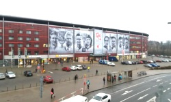 Eden Arena, albo Synot Tip Arena. W sumie to nie wiem, która z tych nazw jest aktualna, ale to mniej ważne. Stadion jest całkiem dobrze wtopiony w lokalny krajobraz (dużo lepiej niż znajdująca się vis a vis galeria Eden), ponieważ murawa znajduje się dobre kilka metrów poniżej poziomu zerowego, tak więc stadion nie jest wyższy od znajdujących się po drugiej stronie ulicy bloków. Ponadto dobrze się kamufluje – od zachodniej strony znajdują się tam biura i kilka odnajmowanych lokali użytkowych, z kolei od północy mamy czterogwiazdkowy hotel Eden (jestem ciekaw jak jest z komfortem wypoczynku w trakcie meczu, ponieważ młyn znajduje się właśnie na trybunie Sever). Dla kontrastu, patrząc na stadion od strony wschodniej (która jest raczej schowana), wygląda on jak squat częściowo pozakrywany banerami.