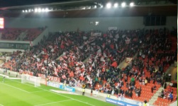 Stadion liczy ponoć 21.000 miejsc, w środku jest całkiem przyjemny i komfortowy. W pełni zadaszony, z jednolitymi czerwonymi krzesełkami (przełamane szarymi fotelami de luxe na sektorze VIP) i dwoma telebimami… no, po prostu jest to nowoczesny stadion na miarę wiodącego zespołu czeskiej ekstraklasy. Zawsze mam problemy z opisem tego typu obiektów, ponieważ nie mają one w sobie nic specjalnie oryginalnego. Jedyne, co rzuciło mi się w oczy to znaczny spadek trybun – były one naprawdę strome. Zastanawiam się, czy to nie jest czasem czeski standard, ponieważ na Dukli Praha było podobnie (z tym, że obiekt Dukli Praha jest na tyle specyficzny, że nie można go w żadnej mierze uznać za coś reprezentatywnego, ale o tym kiedy indziej).