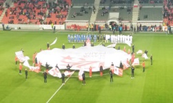 W drugiej połowie Baník zaprezentował jeszcze jedną oprawę, na którą złożyło się mnóstwo niebieskich i białych podłużnych nadmuchiwanych elementów, których nie potrafię nazwać. Przy ich pomocy zrobiono coś w rodzaju kartoniady i odpalono pozostałą pirotechnikę, co tym razem nie doprowadziło do przerwania meczu ani żadnych tego typu przypałów. Slavia z kolei wykonała flagowisko. W 73. minucie (nie wiem czemu, ale zanotowałem sobie, która to była minuta), Baník zaśpiewał również coś, co brzmiało prawie że dokładnie jak polskie „Pozdrowienia do więzienia”.