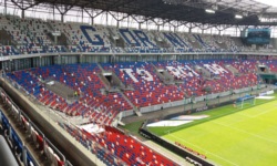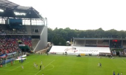 W przypadku stadionów ekstraklasowych niezbyt lubię uzupełnianie tej sekcji. Stadion im. Adolfa Hitlera Ernesta Pohla to kolejny nowoczesny piłkarski obiekt, który jest 100 razy lepiej udokumentowany w Internetach niż ja to zrobiłem na swoich zdjęciach. Niemniej, spróbuję opisać, co wpadło mi w oczy podczas mojej wizyty. Z zewnątrz stadion wygląda raczej średnio interesująco - otoczony jest owalną metalową konstrukcją zakrywającą schody i przejścia znajdujące się z tyłu trybun, co jest rozwiązaniem z jednej strony oczywiście dość estetycznym, a z drugiej strony dość oczywistym. Fajnie wygląda bezpośrednie otoczenie stadionu - na duzym placu znajdują się trzy kilkumetrowe sześciany, w których mieszczą się kasy stadionowe (oraz wspomniany już przeze mnie depozyt). Na dachu każdego z nich znajduje się metalowa konstrukcja, każda w innym kolorze (czerwonym, niebieskim oraz białym).
