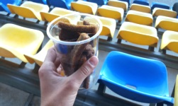 Na tyłach trybuny, poza krową w żółto-niebieskich barwach Ventspils (figury krów porozstawiane są po całym Ventspils i służą tu za pewnego rodzaju atrakcję turystyczną) znajdują się stoiska, gdzie można zakupić piwo, napoje i przegryzki (wszystko w plastikowych kubkach, szkoda tylko, że nie było kwasu chlebowego) oraz pamiątki. Z racji tego, że byłem (jak na moje standardy) na samym końcu świata, gdzie nieprędko powrócę, rzuciłem się na te pamiątki, zakupując szalik klubowy (szarf), pin (znacziok) i breloczek (...eta wiesz'). Za ten zestaw dałem w sumie... 10,50€. Naprawdę. Dodatkowe 1€ zapłaciłem za kubek czegoś chyba typowo bałtyjskiego, czyli podłużnych sucharów chlebowych podsmażanych w oleju z czosnkiem (po rosyjsku nazywało się to po prostu suchariki). Biorąc pod uwagę, że za bilet normalny na mecz Virsligi dałem całe 1,50€ (a ulgowy kosztował połowę tego), dochodzę do wniosku, że jest tu uprawiany totalny dumping cenowy. Może chodzi o to, że burmistrzem miasta jest najbogatszy człowiek na Łotwie, który po prostu zapewnia swoim wyborcom chleb i igrzyska olimpijskie.