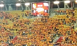 Moja ocena atmosfery, ze względu na fakt, że przybyłem na stadion mniej więcej w 30. minuty meczu, nie będzie pełna. M.in. nie wiem, jak na Słonecznej wygląda początek meczu - czy leci O, Fortuna , czy może disco-polo, czy może jakiś hymn Jagiellonii, czy też może np. disco-polo, które jest hymnem Jagiellonii. Czy leci to z głośników, czy kibice śpiewają to acapella. A jeśli śpiewają kibice, to czy tylko młyn, czy piknik też się przyłącza. Cóż, problem ten pozostanie chyba na zawsze nierozstrzygnięty - biedni czytelnicy, którzy chcą zgłębić ten temat, będą musieli chyba skorzystać z Google.
