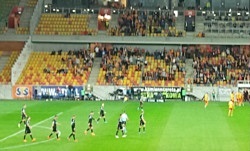 Żeby nie było, że tylko krytykuję jakieś tam wulgarne jednostki na pikniku - młynu Jagiellonii słuchało się z przyjemnością. W sumie patrzyło się również z przyjemnością - co prawda w ten nie najcieplejszy dzień był on dość przerzedzony, jednak właściwie cały był ubrany w żółto-czerwone koszulki meczowe Jagi. Na trybunie wisiało kilka flag - te, które zarejestrowałem, to Jagiellonia , Dzieci Białegostoku (z dodatkowym podpisem słońce wschodzi ze Wschodu - może i tautologia, ale hasło nawet niezłe), JAGA oraz Weterani . Z przykładowych piosenek śpiewanych przez młyn potrafię podać z pamięci tylko:My, chłopcy z Białego Wszyscy za Jednego, za Jagę, za BKS, pójdziemy aż po życia kres!