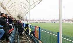 Na stadionie znajduje się... kilka trybun - to jest adekwatne określenie. Przede wszystkim, wzdłuż linii bocznej ciągnie się trybuna główna, która składa się z zaledwie trzech rzędów krzesełek. Cała trybuna jest zadaszona niskim dachem i liczy około 450-500 miejsc siedzących. Trybuna jest co prawda niska, ale znajduje się dosłownie tuż przy boisku. Na plus oceniam fakt, że w życiu nie siedziałem tak blisko linii bocznej. Z kolei na minus fakt, że idąc chodnikiem wzdłuż trybuny niewygodnie jest mijać się z osobą idącą z naprzeciwka, tak jest wąsko. Obok trybuny znajduje się punkt gastronomiczny, gdzie można kupić giętą z grilla, herbatę i być może jakieś inne produkty, ale nie zgłębiałem dokładnie tej kwestii.