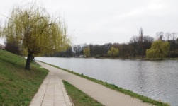 Przyjechałem metrem do stacji Centrum, po czym przeszedłem się na dworzec Warszawa Śródmieście, skąd przejechałem się na Warszawę Wschodnią Szybką Koleją Miejską. Tam zakupiłem bilety kolejowe na dalszą część dnia, a następnie udałem się spacerem w kierunku stadionu Drukarza. Droga prowadziła m.in. na tyłach fabryki Wedla, gdzie rozchodził się apetyczny zapach wedlowskiej czekolady i ptasiego mleczka (spokojnie, o ptasim mleczku jeszcze będzie mowa). Obszedłem także Jezioro Kamionkowskie - jest to naturalny zbiornik wodny (kawałek starorzecza Wisły), liczący kilkaset metrów długości, o którego istnieniu do tej pory nie wiedziałem. Tzn. słyszałem kiedyś nazwę Kamionek (istnieje zresztą B-klasowy klub piłkarski o takiej nazwie), ale wydawało mi się, że jest to jakiś obszar na granicy Warszawy coś jak Solec. No dobrze, może już nie mówmy o mojej znajomości Warszawy. Stadion Drukarza położony jest całkiem malowniczo, ponieważ znajduje się tuż przy jeziorze, w Parku Skaryszewskim.