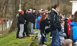 Sobota (wskazówka - jest to dzień następujący po piąteczku), 10 rano, a w Warszawie drużyna z Pragi gra z drużyną z Bielan. Jest to powód, dla którego nie spodziewałem się na meczu więcej niż kilkudziesięciu widzów, ale ku mojemu zdziwieniu, na stadionie pojawiło się ich na oko jakieś dwie setki. Kibice schodzili się na mecz stopniowo, ponieważ abstrahując od żartów o piąteczku, 10 rano to rzeczywiście nie jest wymarzona godzina na czwartą mazowiecką. Jeśli chodzi o kibiców Drukarza, nie dojrzałem wśród nich emblematów kibicowskich i dominowała wśród nich atmosfera koneserska. Czasem motywowali werbalnie piłkarzy do lepszej gry, zwracając się do nich bezpośrednio - część widowni to zapewne rodzina/znajomi zawodników. Co do kibiców Dumy Bielan, byli oni dużo łatwiej rozpoznawalni, ponieważ wielu z nich nosiło tematyczne koszulki, pomarańczowo-czarne czapki, lub miało jakiś inny pomarańczowy akcent w ubiorze, wskazujący na reprezentowany klub. Co ciekawe, zgromadzili się oni przede wszystkim na szczycie trybuny, bezpośrednio za piknikami - nie zajęli betonowych miejsc stojących na skraju trybuny, które dużo bardziej kojarzyły mi się z grupą wyjazdową. Niestety, przez większość meczu nie manifestowali w żaden sposób swojej obecności. Po golu dla Hutnika wykrzyczeli co prawda Haaaa! Kaaaa! eeeeS! HKS! HKS! HKS! , ale nic więcej od siebie wtedy nie dodali.