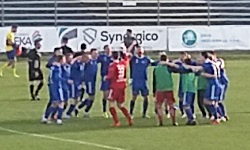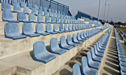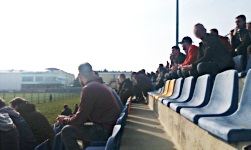 Poza tym, sama trybuna jest przyzwoita i estetyczna; niebieskie i żółte krzesełka składają się w napis UNIA i są całkiem wygodne, z wysokimi oparciami. Na wschodnim skraju trybuny znajduje się ogrodzony (jakby mało było ogrodzeń) sektor gości, co przy okazji oznacza, że gospodarze i goście zasiadają tak naprawdę na tej samej trybunie. Pomiędzy nimi jest jeden sektor buforowy, na którym jest sam beton, bez krzesełek. Na zdjęciu satelitarnym w Internecie chyba widać tam jeszcze krzesełka, ale w realu są one już odkręcone i pozostały po nich tylko jasne ślady na posadzce, niczym w kreskówkach.