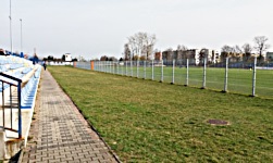 Pomimo że jest to trzecia liga, na stadionie nie było tablicy wyników, co mnie mocno zdziwiło. Albo była, a ja jestem ślepy (czego akurat nie wykluczam). Jednak to, co naprawdę zasługuje na szczególną uwagę w tej relacji, to trybuna północna, z której kibice oglądają mecz, ponieważ jest to unikalne rozwiązanie w skali kraju. Tylko jest to tego rodzaju unikalność, której lepiej, żeby nikt nie naśladował. Otóż trybuna stoi w odległości 15 metrów od linii bocznej boiska (!) i oddziela ją od niego trzymetrowej wysokości płot (!!!). I co ciekawe, nie da się tego wytłumaczyć, że kiedyś w tym miejscu była bieżnia. Wystarczy spojrzeć na zdjęcie satelitarne. Na zdjęciu widzimy boisko, następnie bieżnię, 10 metrów trawnika i dopiero za nim trybunę. A im dłużej patrzę na to zdjęcie, tym bardziej nie jestem w stanie wymyślić stosownego komentarza. I jeszcze to trzymetrowe ogrodzenie oddzielające trybunę od boiska. 10 metrów trawnika jeszcze jestem w stanie w jakiś sposób zrozumieć, ponieważ przynajmniej dzieciaki miały gdzie grać sobie w piłkę podczas meczu (tworzyły kilkuosobowe drużyny, które mieściły się tam bez problemu), ale ten płot stanowi dla mnie prawdziwą zagadkę... Serio, w Skierniewicach istnieje takie zagrożenie dla piłkarzy ze strony kibiców? Albo na odwrót?