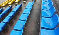 Kėdainių miesto stadionas jest częścią kompleksu sportowego, w którego skład wchodzi jeszcze hala sportowa. Hala służy lokalnym koszykarzom, którzy grają chyba w koszykarskim odpowiedniku Ligi Europy, ale jako Chomik Piłkarski oczywiście skupię się na stadionie. Stadion zgodnie z oficjalnymi danymi liczy 3000 miejsc siedzących (ha! czyli więcej niż hala! Litwini jednak wiedzą, co dobre...), znajdujących się na dwóch odkrytych trybunach położonych wzdłuż linii bocznej. Od strony zachodniej znajduje się trybuna o ośmiu rzędach żółtych i niebieskich krzesełek. Za trybuną znajduje się nasyp kolejowy i raz na jakiś czas przejeżdża tamtędy jakiś pociąg. Zazwyczaj towarowy, ale pod koniec meczu być może przejeżdżał ten odjeżdżający z Wilna o 14:15. W centrum trybuny, na wysokiej konstrukcji znajduje się blaszana budka dla spikera/kamerzysty.