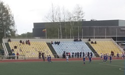 Barwami klubowymi zarówno gospodarzy jak i gości z Kretyngi jest kolor niebieski. W trakcie rozgrzewki piłkarze obydwu drużyn mieli na sobie czarne bluzy i niebieskie spodenki - kiedy drużyny zeszły przed meczem do szatni i wróciły we właściwych strojach meczowych, okazało się na szczęście, że jedni mieli na sobie niebieskie, a drudzy białe trykoty. Pozostało mi już tylko ustalić, którzy to Nevėžis, a którzy to Minija. Lepiej grali ci w białych koszulkach, ale reakcje kibiców na trybunach były dość stonowane i nie do końca byłem pewien, czy to na pewno gospodarze. A biali od początku wyprowadzali całkiem konkretne akcje - w 6. minucie Gėgžna próbował strzału w okienko, ale kąt był na tyle ostry, że bramkarz raczej musiał to odbić. W 17. minucie strzał z woleja Kugysa został zblokowany przez obrońców w niebieskich trykotach. W 28. minucie miało miejsce duże nieporozumienie pomiędzy stoperami niebiesko-niebieskich, w wyniku którego Inta zgrał piłkę głową do napastnika biało-niebieskich. Kugys wbiegł z piłką w pole karne i w sytuacji sam na sam pokonał Kazbarisa. Kibice poderwali się z miejsc, a jeden z dzieciaków ruszył w kierunku tablicy i zmienił wynik na 1:0.